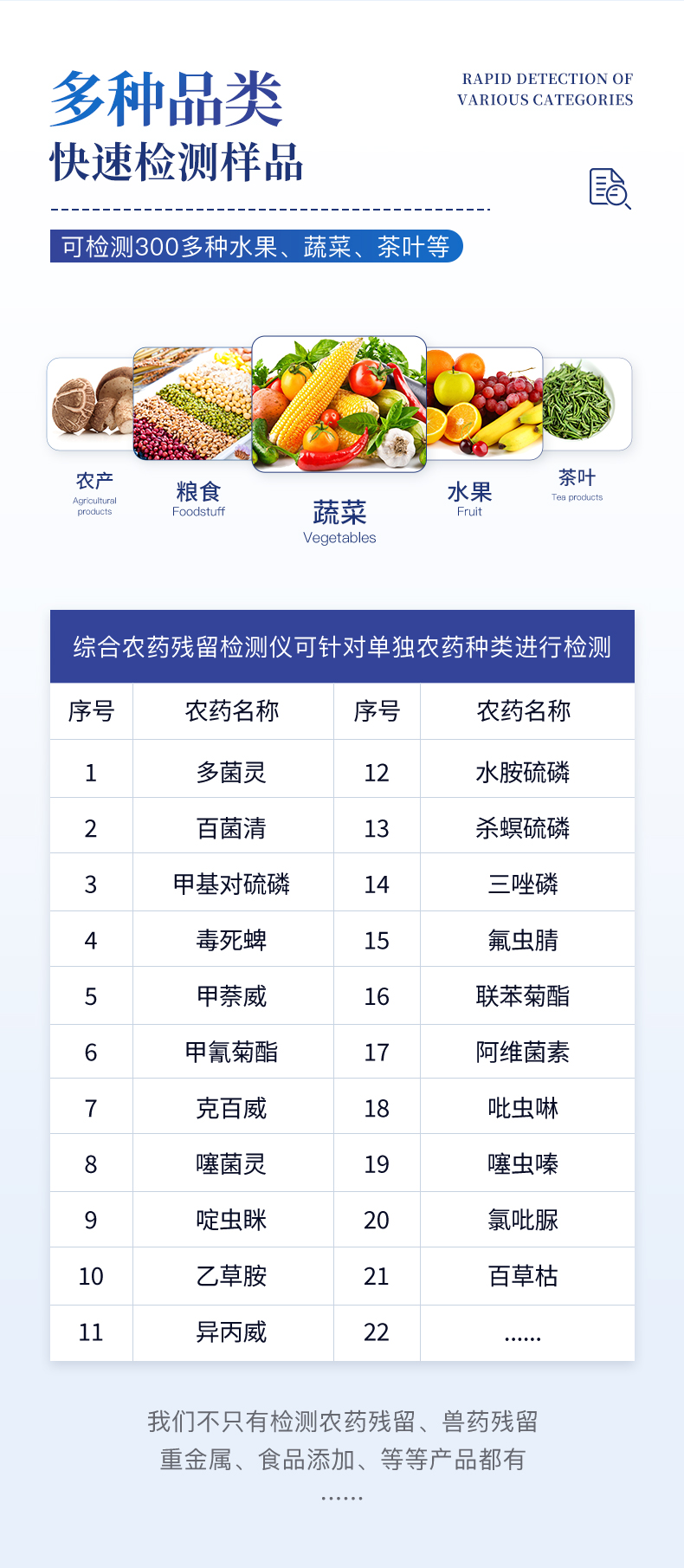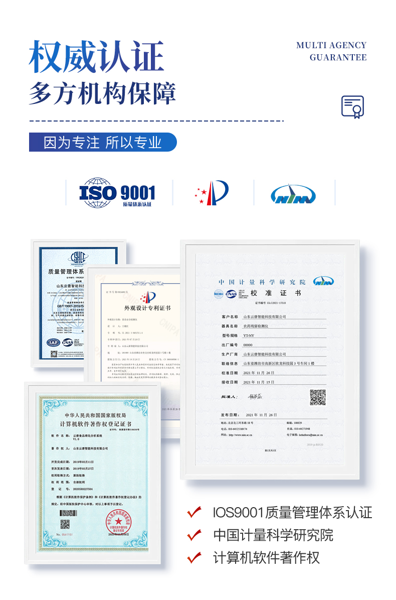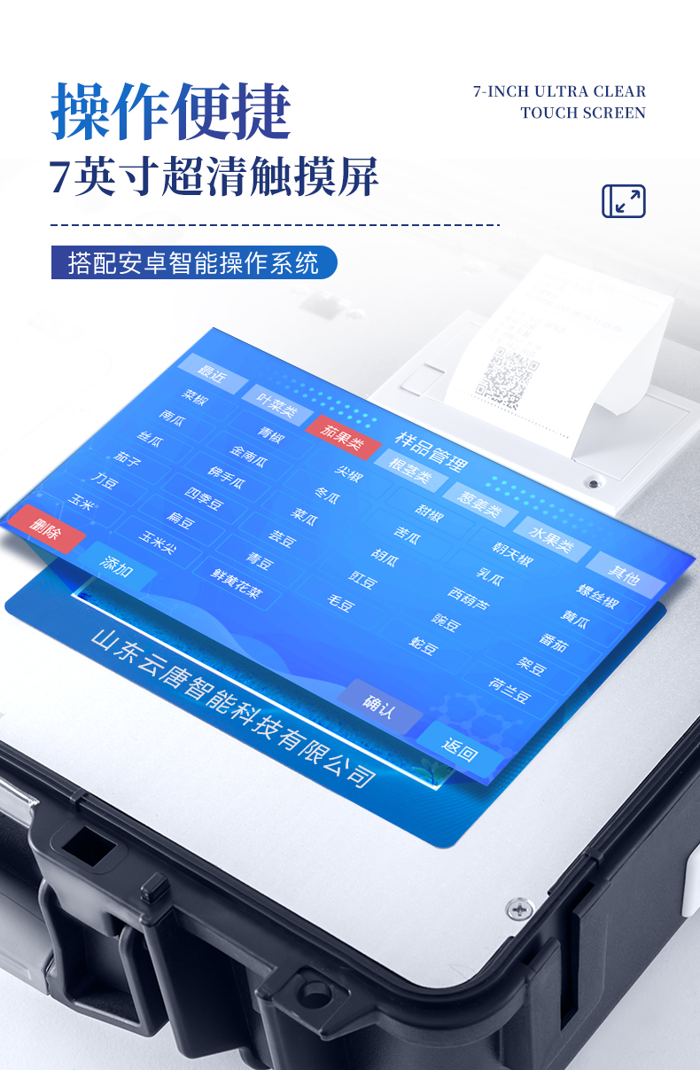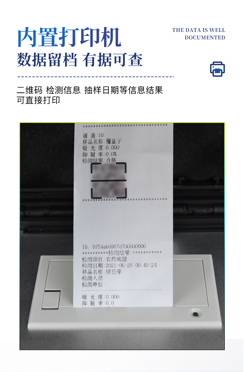 | 隨著人民生活水平的不斷提升,市場(chǎng)對(duì)茶葉的把控愈加嚴(yán)格。針對(duì)現(xiàn)狀,我司專門研發(fā)生產(chǎn)--茶葉專用的農(nóng)藥殘留速測(cè)儀;定位茶農(nóng)、茶商、茶葉企業(yè)使用。 此外還可用于果蔬茶生產(chǎn)基地和農(nóng)貿(mào)批發(fā)銷售市場(chǎng)現(xiàn)場(chǎng)檢測(cè),餐館、學(xué)校、食堂、家庭果蔬加工前的安全速測(cè)等。 | 檢測(cè)通道: 5個(gè)檢測(cè)通道,可以同時(shí)測(cè)試多個(gè)樣品,每個(gè)樣品由程序控制分別獨(dú)立工作,不會(huì)互相干擾。 | 顯示方式:≥5英寸液晶觸摸屏顯示,人性化中文操作界面,讀數(shù)直觀、簡(jiǎn)單。 | 配備嵌入式高速熱敏打印機(jī),可選擇手動(dòng)打印或者自動(dòng)打印,三分鐘出打印結(jié)果。 | 光源采用進(jìn)口超高亮發(fā)光二極管,具有低功耗、穩(wěn)定性強(qiáng)、高靈敏度,高檢測(cè)精度,高重復(fù)性精度,光源可控、響應(yīng)速度快等優(yōu)點(diǎn)。 | 采用標(biāo)準(zhǔn)USB接口設(shè)計(jì),免驅(qū)動(dòng)安裝,方便數(shù)據(jù)的存貯和移動(dòng),并可隨時(shí)與計(jì)算機(jī)直接相連,并且可用計(jì)算機(jī)控制儀器。實(shí)現(xiàn)數(shù)據(jù)查詢、瀏覽、分析、統(tǒng)計(jì)、打印等。 | 智能化程度高,儀器具有自檢功能:具有開(kāi)機(jī)自檢和調(diào)零功能,具有自動(dòng)檢測(cè)重復(fù)性功能 | 內(nèi)置強(qiáng)大的數(shù)據(jù)庫(kù),可在儀器上直接選擇樣品名稱、檢測(cè)指標(biāo)、送檢單位等信息,也可在儀器上直接編輯錄入樣品名稱、檢測(cè)指標(biāo)、送檢單位等信息并保存進(jìn)樣品數(shù)據(jù)庫(kù)。 | 支持Wifi網(wǎng)絡(luò),數(shù)據(jù)可局域網(wǎng)和互聯(lián)網(wǎng)數(shù)據(jù)上傳,檢測(cè)結(jié)果直接傳至食品安全監(jiān)管平臺(tái)。進(jìn)行區(qū)域食品安全監(jiān)管及大數(shù)據(jù)分析處理,檢測(cè)區(qū)域食品安全長(zhǎng)短期動(dòng)態(tài),達(dá)到食品安全問(wèn)題預(yù)估、預(yù)警 |