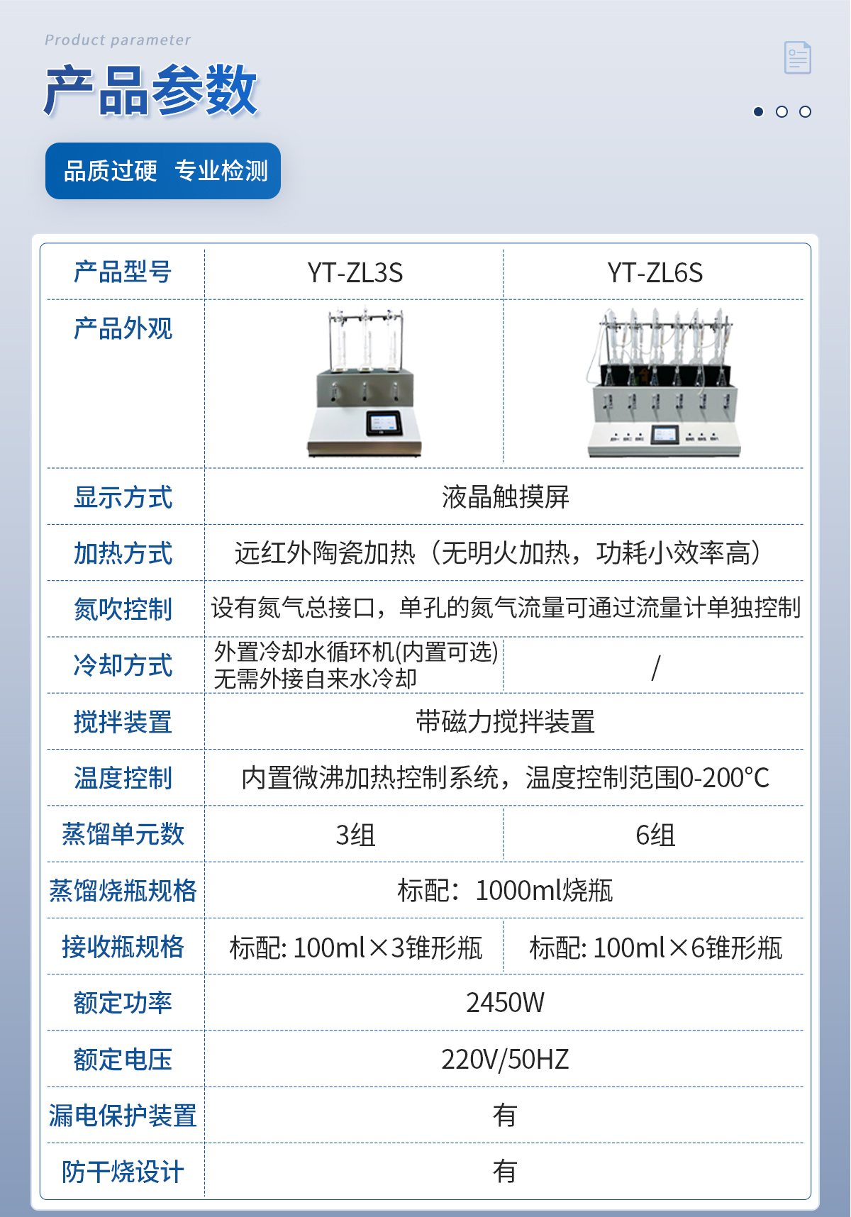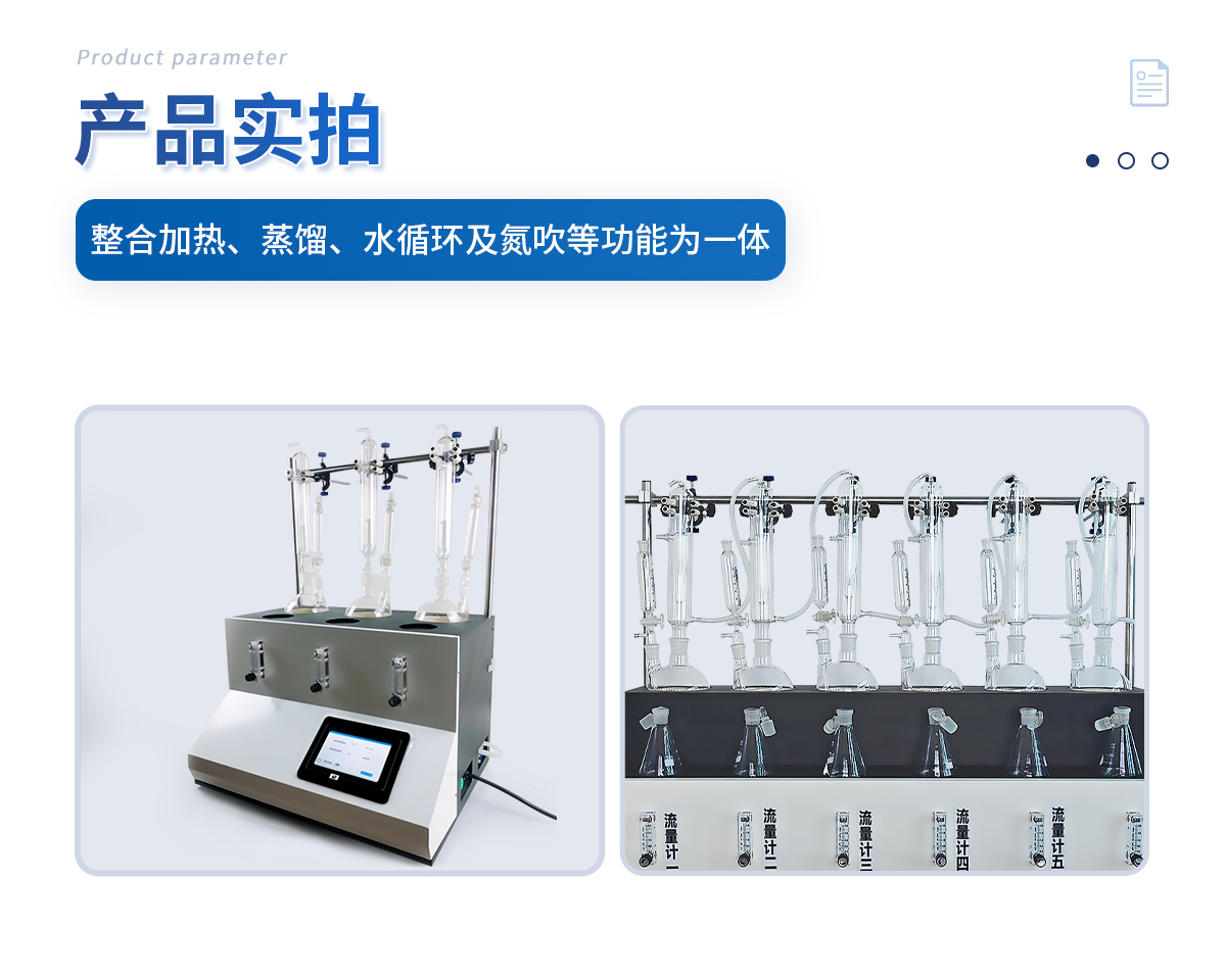 主要原理是根據(jù)藥典中所提供的檢測方法,將中藥材以蒸餾法進(jìn)行處理,樣品中的亞硫酸鹽系列物質(zhì)加酸處理后轉(zhuǎn)化為二氧化硫后,隨氮?dú)饬鲙氲胶须p氧水的吸收瓶中,雙氧水將其氧化為硫酸根離子,采用酸堿滴定法測定,計(jì)算藥材及飲片中的二氧化硫殘留量。本產(chǎn)品在嚴(yán)格遵循藥典要求的基礎(chǔ)上,整合加熱,蒸餾,水循環(huán)及氮吹等功能為一體,可同時提供3-6個樣品(空白樣,平行樣)的處理,從而極大的提高了檢測數(shù)據(jù)的精度和減少了工作時間。