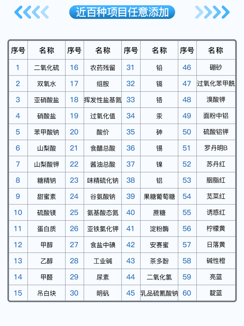10、儀器具有多品類多種類樣品菜單庫,可靈活選擇檢測樣品,不同的檢測通道可同時檢測不同的樣品項目。也可在儀器上直接編輯錄入樣品名稱、檢測指標(biāo)、送檢單位等信息并保存進(jìn)樣品數(shù)據(jù)庫。