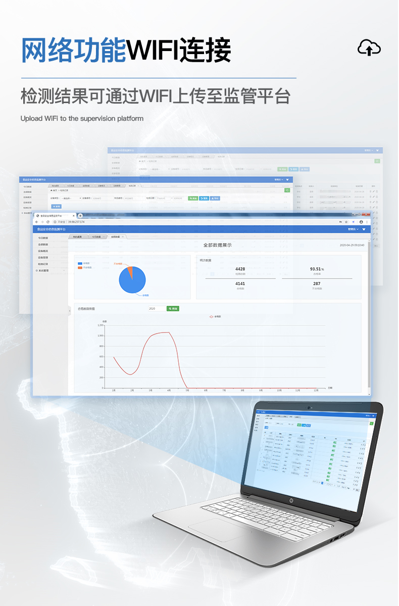 8、儀器帶有監(jiān)管平臺。數(shù)據(jù)可局域網(wǎng)和互聯(lián)網(wǎng)數(shù)據(jù)上傳,檢測結(jié)果直接傳至食品安全監(jiān)管平臺。進(jìn)行區(qū)域食品安全監(jiān)管及大數(shù)據(jù)分析處理,檢測區(qū)域食品安全長短期動態(tài),達(dá)到食品安全問題預(yù)估、預(yù)警。