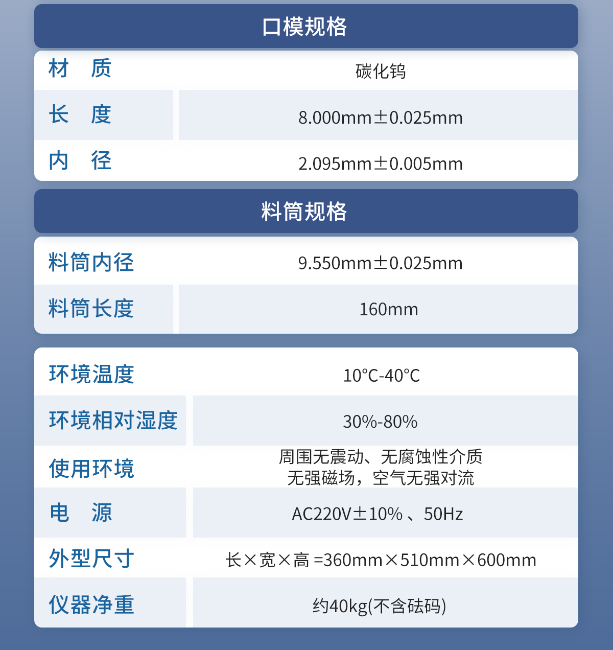 附件:工具箱一個(gè),紗布一卷,口模一個(gè),壓料桿(清潔桿)一支、口模通孔器一支.漏斗一個(gè).夾子一把.砝碼一套.