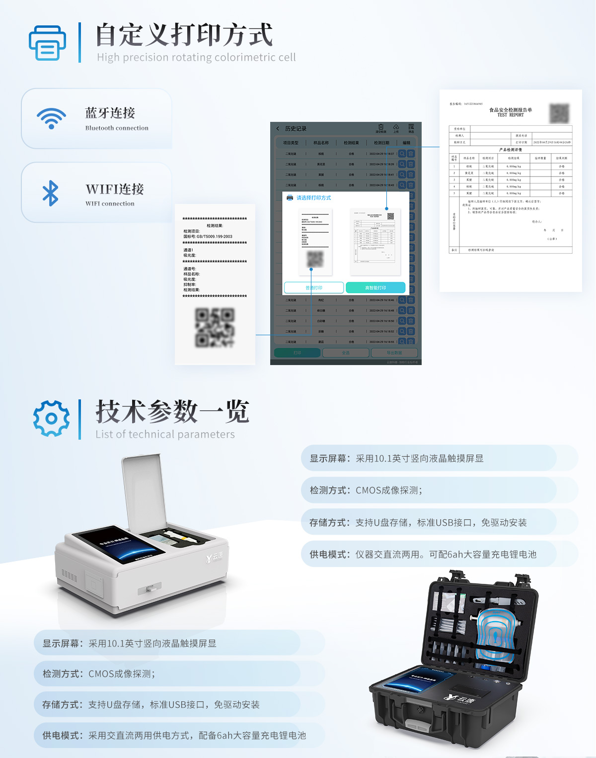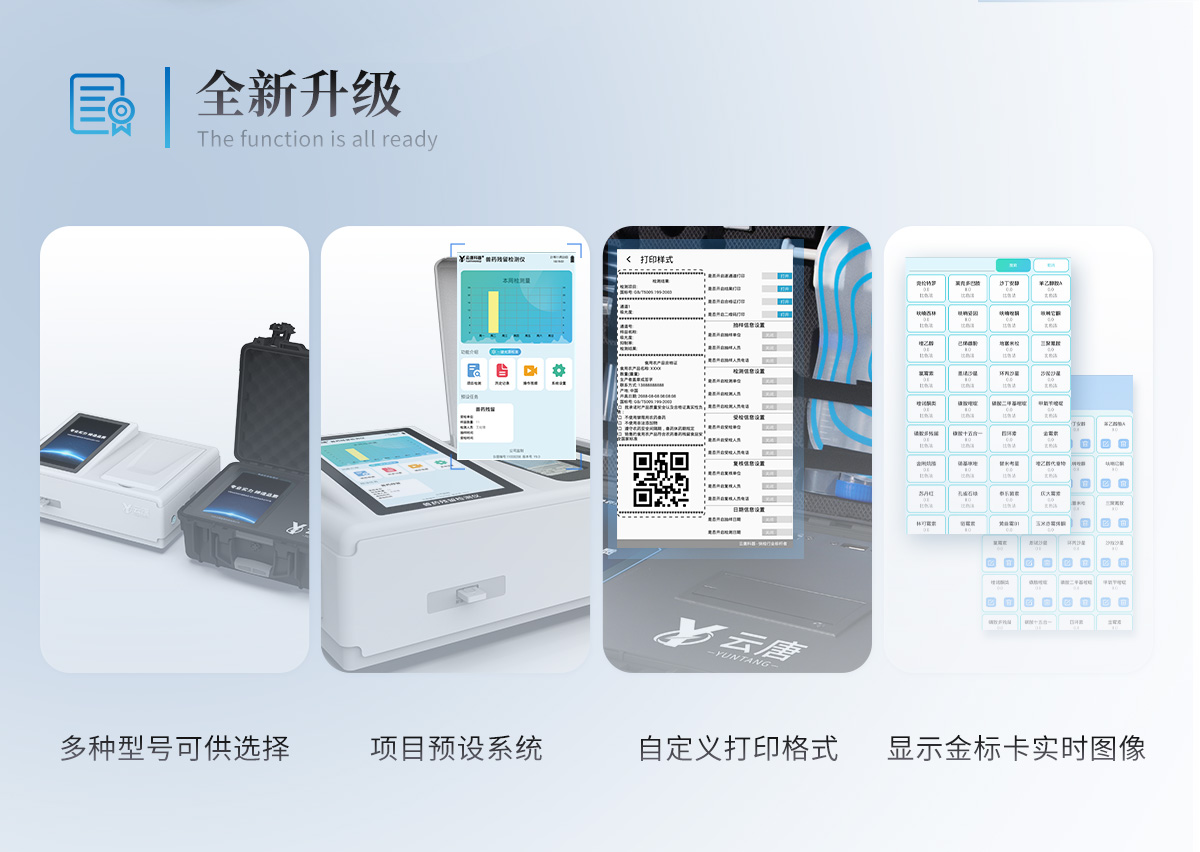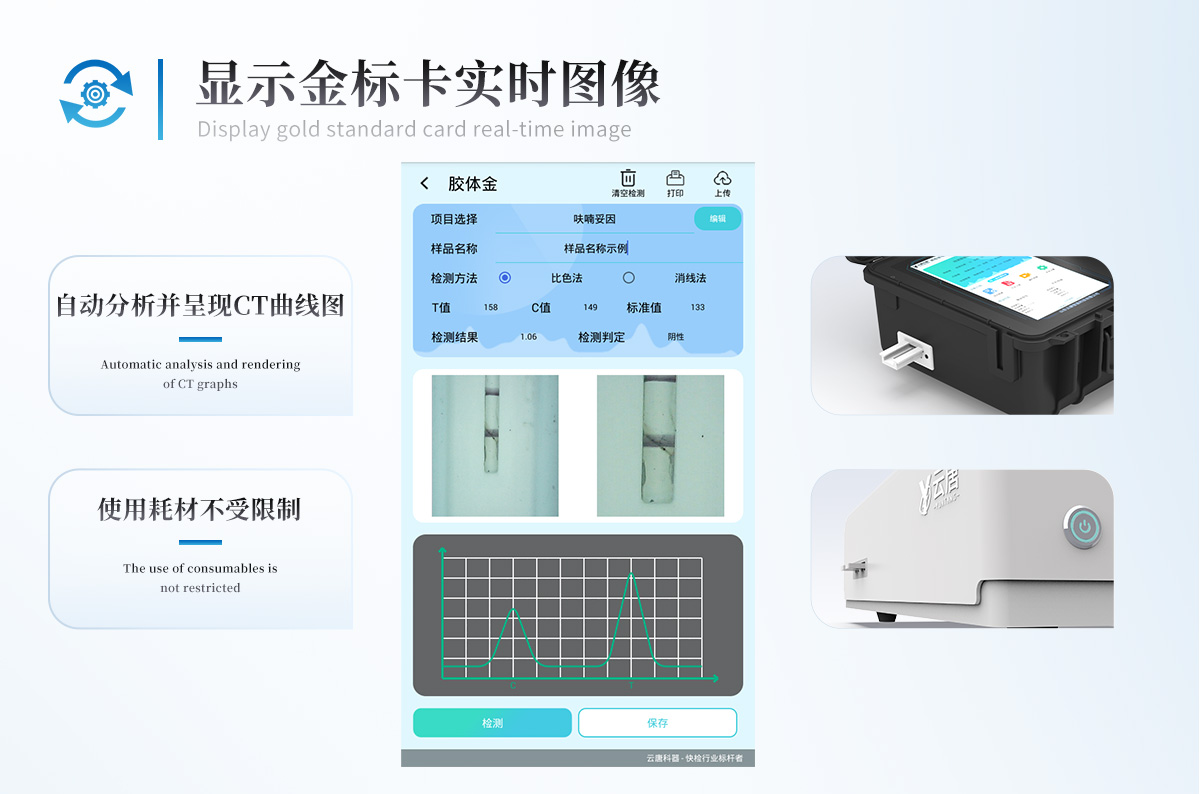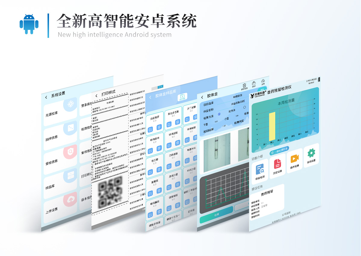 | 儀器采用10.1英寸液晶觸摸屏顯,搭配運行安卓智能操作系統(tǒng),主控芯片采用ARM Cortex-A7,RK3288/4核處理器,主頻1.88Ghz,運轉速度更快速,性能更強。 | 儀器功能包括:膠體金檢測模塊、數(shù)字化管理模塊、無線通訊模塊等,可以滿足同一軟件下實現(xiàn)所有檢測項目的檢測,并在同一窗口展示檢測結果。 | 一體化便攜式快檢設備,采用交直流兩用供電方式,可連接車載電源,配備6ah大容量充電鋰電池,可以滿足現(xiàn)場及流動檢測使用的需求。儀器尺寸:43×35×20cm, 主機凈重:5.1kg | 系統(tǒng)自帶數(shù)據(jù)集成模塊,設備首頁自動統(tǒng)計檢測數(shù)據(jù)包含:周檢測數(shù)據(jù)、月檢測數(shù)據(jù),全部檢測總數(shù)量,均包含檢測總數(shù),合格數(shù),不合格數(shù),以及相關柱形分析圖,對各項檢測數(shù)據(jù)清晰掌握,無需電腦查詢,更加快捷直觀。 | 儀器具有任務預設模塊,可在樣品送檢前提前預設樣品名稱、檢測指標、送檢單位等信息,樣品送檢時一鍵調(diào)取保存信息,檢測更加方便快捷。 | 軌道式自動傳輸掃描方式,可實時顯示金標卡實時圖像,系統(tǒng)自動分析并呈現(xiàn)出CT曲線圖,CT線自動識別,無需手動調(diào)整,完成檢測后自動退出檢測卡。 | 結果判定線可修改,對照值標定值可保存,斷電不丟失數(shù)據(jù)。 | 兼容市場上其他膠體金卡,使用耗材不受限制,極大增強用戶使用體驗。 | 儀器檢測系統(tǒng)擁有龐大數(shù)據(jù)庫,并且構建了完善的檢索、修訂功能。食品庫涵蓋多種樣品名稱,可按需添加或刪除、編輯樣品名稱;產(chǎn)品數(shù)據(jù)庫以及歷史檢測記錄支持一鍵檢索功能。 | 系統(tǒng)打印自定義化,打印格式多樣化,產(chǎn)品合格證(國家標準要求),二維碼,抽樣信息、檢測信息,受檢信息、復核信息、抽樣日期、檢測日期等信息結果,可按需求自行設置打印內(nèi)容。 | A4紙版本報告打印功能(可選配):設備擁有兩種結果展示方式,可以自動生成A4打印模板和小票打印模板兩種樣式,可通過WiFi及網(wǎng)線等方式鏈接外置打印機可進行打印 | 儀器具有 wifi 聯(lián)網(wǎng)上傳、RJ45網(wǎng)線連接功能,可以快速上傳數(shù)據(jù)。同步對接監(jiān)管平臺,數(shù)據(jù)可局域網(wǎng)和互聯(lián)網(wǎng)數(shù)據(jù)上傳,檢測結果直接傳至食品安全監(jiān)管平臺。進行區(qū)域食品安全監(jiān)管及大數(shù)據(jù)分析處理與數(shù)據(jù)統(tǒng)計,檢測區(qū)域食品安全長短期動態(tài),達到食品安全問題預估、預警。 | 設備支持U盤存儲,標準USB接口,免驅(qū)動安裝。檢測結果存儲容量20萬條以上,可生成Excel表格,進行一鍵拷貝,并具有登錄保護功能,可設置用戶名及密碼,規(guī)范不同人員操作權限,防止非工作人員操作,并且可以進行重新校準、鎖定、恢復出廠設置功能。儀器固件可升級,后期檢測項目可擴充。 | 儀器具備遠程升級功能,可定向分客戶分儀器更新,開機后自動更新,并可持續(xù)性免費更新系統(tǒng)版本,無需像傳統(tǒng)產(chǎn)品返廠更新,節(jié)省時間及人力成本并避免了物流運輸返廠升級導致設備損壞的潛在風險。 |