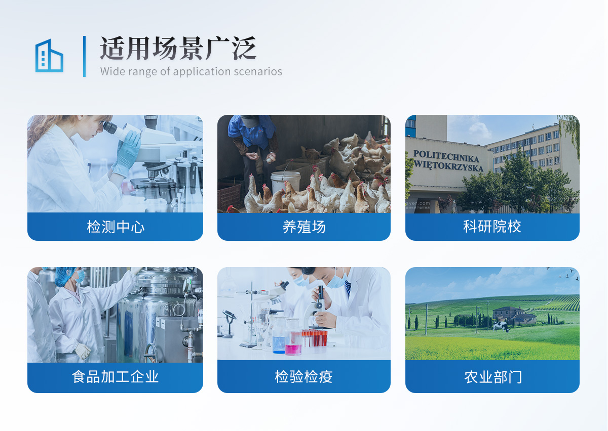 | 瘦肉精激素類(獸藥):鹽酸克倫特羅、沙丁胺醇、萊克多巴胺、己烯雌酚等 | 抗生素殘留類(獸藥):四環(huán)素類、硝基呋喃類、磺胺類、β-興奮劑類、沙星類、磺胺類、喹諾酮類,甲砜霉素,氟苯尼考,金剛烷胺、替米考星、慶大霉素、林可霉素、鏈霉素、恩諾沙星、環(huán)丙沙星、頭孢啦啶、青霉素、阿莫西林等 | 水產(chǎn)品安全類:孔雀石綠、氯霉素、呋喃妥因、呋喃西林、呋喃它酮、呋喃唑酮等 | 蛋類藥物殘留:氯霉素,四環(huán)素,磺胺類,喹諾酮類,呋喃西林,呋喃它酮,呋喃妥因,呋喃唑酮,氟苯尼考,阿莫西林、頭孢氨芐、紅霉素、鏈霉素等 | 動物疫病類:禽流感、新城疫、牛羊口蹄疫、牛羊結核病、牛羊包蟲、牛羊布病、小反芻獸、豬藍耳病毒、豬瘟病毒、豬偽狂犬病毒、豬細小、豬圓環(huán)、犬細小病毒、犬瘟熱病毒、犬狂犬病毒等 | 真菌毒素殘留:食用油、糧食及飼料中黃曲霉毒素B1、黃曲霉毒素總量,奶中黃曲霉毒素M1、嘔吐毒素、玉米赤霉烯酮、赭曲霉毒素A、T2毒素、伏馬毒素等 |