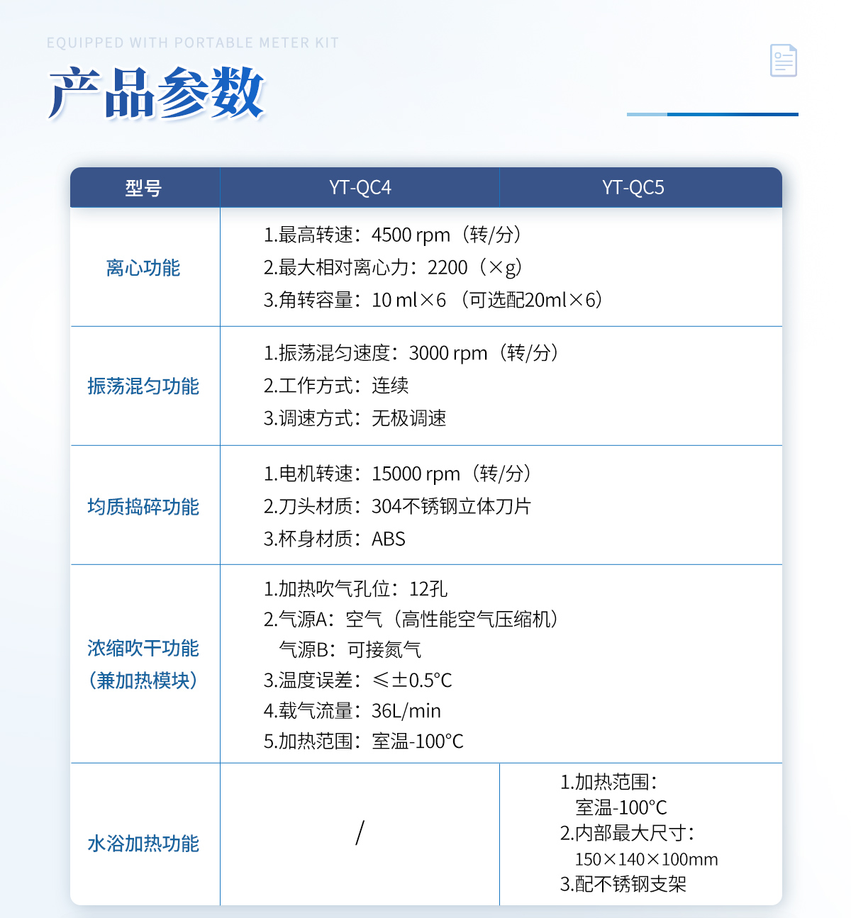 | 離心功能 1.**轉(zhuǎn)速:4500 rpm(轉(zhuǎn)/分) 2.**相對(duì)離心力:2200(×g) 3.角轉(zhuǎn)容量:10 mlx6 (可選配20mlx6) | 振蕩混勻功能 1.振蕩混勻速度:3000 rpm(轉(zhuǎn)/分) 2.工作方式:連續(xù) 3.調(diào)速方式:無(wú)極調(diào)速 | 均質(zhì)搗碎功能 1.電機(jī)轉(zhuǎn)速:15000 rpm(轉(zhuǎn)/分) 2.刀頭材質(zhì):304不銹鋼立體刀片 3.杯身材質(zhì):ABS | 濃縮吹干功能(兼加熱模塊) 1.加熱吹氣孔位: 12孔 2.氣源A: 空氣(高性能空氣壓縮機(jī)) 氣源B: 可接氮?dú)? 3.溫度誤差:≤±0.5℃ 4.載氣流量:36L/min 5.加熱范圍:室溫-100℃ | 水浴加熱 1.加熱范圍:室溫-100℃ 2.內(nèi)部**尺寸:150mmX140mmX100mm 3.配不銹鋼支架 |