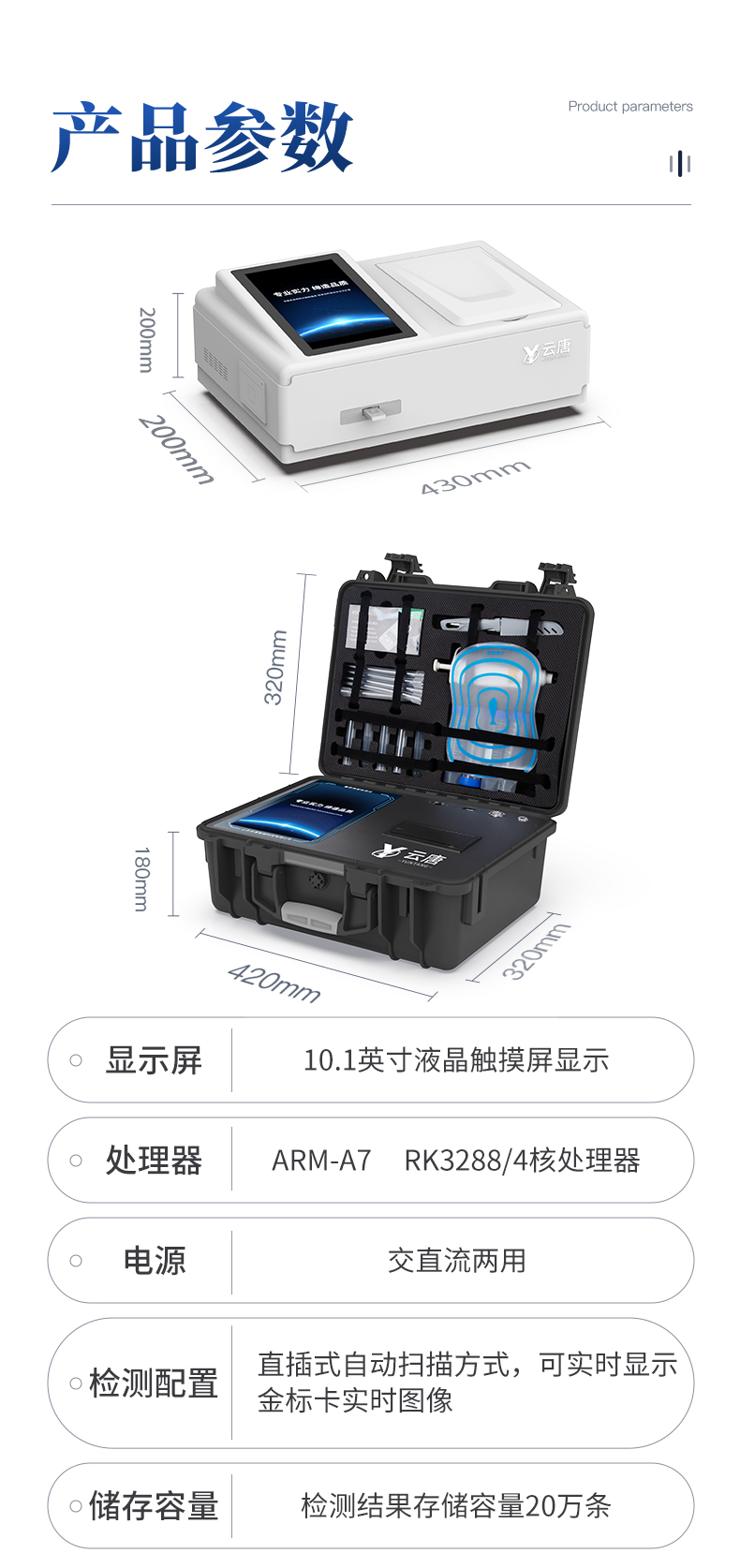 | 1、儀器采用臺式一體化系統(tǒng)檢測技術(shù),將分光光度模塊、數(shù)字化管理模塊、無線通訊模塊高度集成于一體,支持檢測幾十種食品安全檢測項目,同時預(yù)留升級檢測方法。 | 2、儀器檢測模塊標(biāo)準(zhǔn)化、智能化,檢測項目可隨意自由組合。檢測箱體內(nèi)置多個標(biāo)準(zhǔn)檢測單元,檢測模塊可以調(diào)整配置。 | 3、顯示屏幕:儀器采用7英寸液晶觸摸屏,搭配運行安卓智能操作系統(tǒng),主控芯片采用ARM Cortex-A7,RK3288/4核處理器,主頻1.88Ghz,操作方便,性能更強(qiáng)。 | 4、檢測通道:≥12通道;采用精密旋轉(zhuǎn)比色池設(shè)計,使用同芯片同光源校準(zhǔn)精度,解決不同光源之間的誤差值,更加準(zhǔn)確**。 | 5、儀器光源:高精度進(jìn)口四波長冷光源,每個通道均配置 410、520、590、630nm 波長光源,標(biāo)配**的光路切換裝置,專利光路切換功能可實現(xiàn)64波長,并且所有檢測項目可實現(xiàn)所有通道同時檢測。 | 6、通訊接口:配備無線通信模塊、可選配4G(APN)通訊模塊和藍(lán)牙傳輸,同時具有USB接口,可以多方式實現(xiàn)數(shù)據(jù)保存及數(shù)據(jù)傳輸。 | 7、存儲方式:支持U盤存儲,標(biāo)準(zhǔn)USB接口,免驅(qū)動安裝。檢測結(jié)果存儲容量20萬條以上,可生成Excel表格進(jìn)行拷貝,并具有登錄保護(hù)功能。 | 8、智能化操作系統(tǒng) | 8.1、操作系統(tǒng):儀器可在同一檢測界面自動對應(yīng)相關(guān)檢測通道,一次性選擇1-12個樣品名稱,無需退出界面,節(jié)省操作時間。并可以對每個通道屬性和樣品信息單獨進(jìn)行編輯,例如送檢單位、人員,檢測人員等,打印時勾選打印顯示。 | 8.2、限量規(guī)判系統(tǒng):具有限量查詢、添加物質(zhì)合規(guī)判定系統(tǒng)。檢測出結(jié)果后,系統(tǒng)自動調(diào)用系統(tǒng)數(shù)據(jù)庫中相關(guān)國標(biāo)進(jìn)行比對判定,客觀顯示結(jié)果是否合格。 | 8.3、數(shù)據(jù)監(jiān)管系統(tǒng):同步對接監(jiān)管平臺,數(shù)據(jù)可局域網(wǎng)和互聯(lián)網(wǎng)數(shù)據(jù)上傳,檢測結(jié)果可選擇直接傳至食品安全監(jiān)管平臺。進(jìn)行區(qū)域食品安全監(jiān)管及大數(shù)據(jù)分析處理與數(shù)據(jù)統(tǒng)計,檢測區(qū)域食品安全長短期動態(tài),達(dá)到食品安全問題預(yù)估、預(yù)警。 | 8.4、打印系統(tǒng):內(nèi)置全新打印機(jī),可以打?。喉椖棵Q,二維碼,抽樣信息、檢測信息,受檢信息、復(fù)核信息、抽樣日期、檢測日期等信息的打印。 | 9、供電模式:儀器交直流兩用,直流12V供電(標(biāo)配),可連接車載電源,亦可選配6ah大容量充電鋰電池,電量可實時顯示,方便戶外流動測試。 | 10、儀器具有重新校準(zhǔn)、鎖定、恢復(fù)出廠設(shè)置功能, | 11、外觀尺寸:415X310X150(mm) ,并可加配鋁合金手提箱 |
