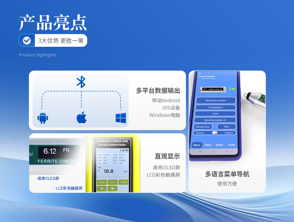 鐵素體含量檢測儀操作簡單 List-Magnetik公司 FERRITE-CHECK 140鐵素體含量檢測儀是一款設計緊湊、使用方便的便攜儀器,儀器配有集成探頭,儀器符合Basel標準DIN EN ISO 8249,使用磁感應法測量奧氏體鋼和雙相鋼中的鐵素體含量。 高亮OLED顯示鐵素體含量 FERRITE-CHECK 140鐵素體含量檢測儀只有一個按鈕,并配有多語言菜單導航,非常易于使用。高亮度OLED屏顯示FN或Fe%的測量結果。 測量焊縫中的鐵素體含量 特別是對于焊接的雙相鋼,重要的是要知道焊縫是否有足夠的鐵素體含量來保證焊縫的強度。鐵素體含量低的話,焊縫受熱后較容易產生裂紋,但如果鐵素體含量過高,焊縫的韌性和延展性將會喪失。 快速連續(xù)鐵素體含量測量 使用FERRITE-CHECK 140鐵素體含量檢測儀,可以非常準確和快速地測定鐵素體含量。檢測光滑或拋光表面上的焊縫時,可以將儀器切換到快速連續(xù)測量模式。當探頭放置在表面上并沿表面移動時,測量值將連續(xù)存儲,在提起探頭后,屏幕將顯示的*小值、**值和平均值組成的統(tǒng)計信息。 校準鐵素體含量檢測儀 FERRITE-CHECK 140鐵素體含量檢測儀配有3個校準標準片,可追溯到NIST 管理和發(fā)送測量數(shù)據(jù)與免費的應用程序 為了進一步處理測量數(shù)據(jù),您可以將FERRITE-CHECK 140鐵素體含量檢測儀與移動Android和iOS設備配對。或者與一臺Windows電腦通信。這是由低功耗藍牙技術(BLE)實現(xiàn)的。使用Lima Connect應用程序,您可以管理項目并在照片上分配測量點。測量結果可以統(tǒng)計評估和圖形顯示。這款應用適用于安卓、iOS和Windows系統(tǒng),軟件免費的。