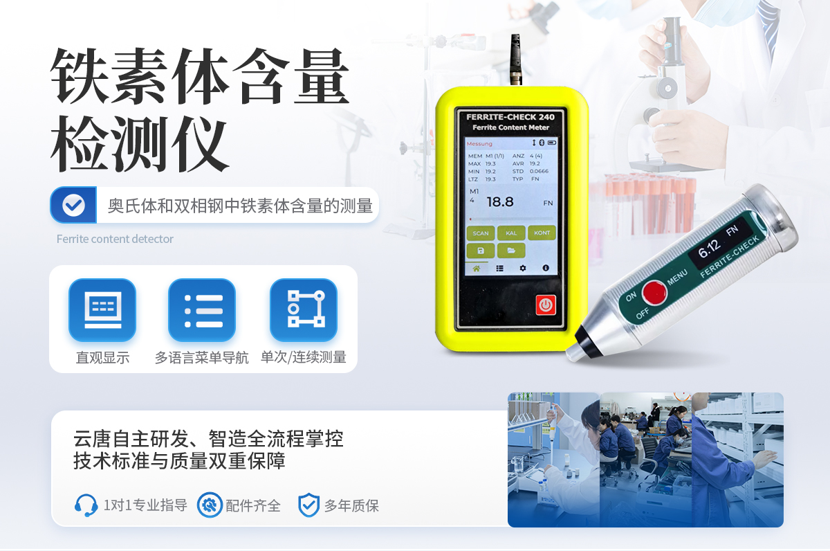 FERRITE-CHECK 240鐵素體含量檢測儀采用分體式的設計,使用方便,儀器符合Basel標準DIN EN ISO 8249,使用磁感應法測量奧氏體鋼和雙相鋼中的鐵素體含量。 全新測頭