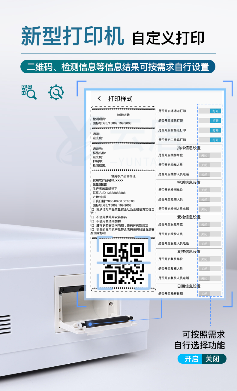 | 儀器采用臺(tái)式一體化系統(tǒng)檢測(cè)技術(shù),將分光光度模塊、膠體金檢測(cè)模塊、新型農(nóng)殘檢測(cè)模塊、數(shù)字化管理模塊、無(wú)線通訊模塊高度集成于一體,支持檢測(cè)200種食品安全檢測(cè)項(xiàng)目,同時(shí)預(yù)留升級(jí)檢測(cè)方法。 | 儀器檢測(cè)模塊標(biāo)準(zhǔn)化、智能化,可隨意自由組合。檢測(cè)箱體內(nèi)置多個(gè)標(biāo)準(zhǔn)檢測(cè)單元,檢測(cè)模塊可以調(diào)整配置。 | 顯示屏幕:儀器采用10.1英寸豎向液晶觸摸屏顯,搭配運(yùn)行安卓智能操作系統(tǒng),主控芯片采用ARM Cortex-A7,RK3288/4核處理器,主頻1.88Ghz,操作方便,性能更強(qiáng)。 | 檢測(cè)通道:≥12通道;采用精密旋轉(zhuǎn)比色池設(shè)計(jì),使用同芯片同光源校準(zhǔn)精度,解決不同光源之間的誤差值。1-12通道間誤差0.1%。(***:**202022821055.2) | 儀器光源:高精度進(jìn)口四波長(zhǎng)冷光源,每個(gè)通道均配置 410、520、590、630nm 波長(zhǎng)光源,標(biāo)配**的光路切換裝置,專利光路切換功能可實(shí)現(xiàn)64波長(zhǎng),并且所有檢測(cè)項(xiàng)目可實(shí)現(xiàn)所有通道同時(shí)檢測(cè)。 | 設(shè)備可一鍵校準(zhǔn),自動(dòng)保存校準(zhǔn)數(shù)據(jù),自動(dòng)對(duì)比校驗(yàn),得到精準(zhǔn)光源,采用Android SP存儲(chǔ)數(shù)據(jù),光源數(shù)據(jù)永不丟失,方便每一次使用。 | 通訊接口: 配備無(wú)線通信模塊、可選配4G(APN)通訊模塊和藍(lán)牙傳輸,同時(shí)具有雙USB接口以及RJ45網(wǎng)線接口,可以多方式實(shí)現(xiàn)數(shù)據(jù)保存及數(shù)據(jù)傳輸。 | 存儲(chǔ)方式: 支持U盤(pán)存儲(chǔ),標(biāo)準(zhǔn)USB接口,免驅(qū)動(dòng)安裝。檢測(cè)結(jié)果存儲(chǔ)容量20萬(wàn)條以上,可生成Excel表格進(jìn)行拷貝,并具有登錄保護(hù)功能。 | 智能化操作系統(tǒng): | 操作系統(tǒng):儀器可在同一檢測(cè)界面自動(dòng)對(duì)應(yīng)相關(guān)檢測(cè)通道,一次性選擇1-12個(gè)樣品名稱,無(wú)需退出界面,節(jié)省操作時(shí)間。并可以對(duì)每個(gè)通道屬性和樣品信息單獨(dú)進(jìn)行編輯,例如送檢單位、人員,檢測(cè)人員等,打印時(shí)勾選打印顯示。 | 數(shù)據(jù)集成系統(tǒng):設(shè)備首頁(yè)自動(dòng)匯總分析檢測(cè)數(shù)據(jù),包含:周檢測(cè)數(shù)據(jù)、月檢測(cè)數(shù)據(jù),全部檢測(cè)總數(shù)量,均包含檢測(cè)總數(shù),合格數(shù),不合格數(shù),以及相關(guān)柱形分析圖,各項(xiàng)檢測(cè)數(shù)據(jù)一目了然,無(wú)需電腦查詢,更加快捷直觀。 | 數(shù)據(jù)庫(kù)系統(tǒng):十幾項(xiàng)數(shù)據(jù)庫(kù)分類管理儀器:包含項(xiàng)目類型、項(xiàng)目數(shù)據(jù)、檢測(cè)數(shù)據(jù)、歷史記錄、國(guó)標(biāo)信息、曲線信息、采樣信息、檢測(cè)信息、受檢信息、復(fù)核信息、圖表信息、光源校準(zhǔn)信息、打印樣式信息、樣品庫(kù)信息等等,數(shù)據(jù)庫(kù)之間互相協(xié)調(diào)聯(lián)動(dòng)保證數(shù)據(jù)的真實(shí)完整性。同時(shí)產(chǎn)品數(shù)據(jù)庫(kù)以及歷史檢測(cè)記錄支持一鍵檢索功能。 | 限量規(guī)判系統(tǒng):具有限量查詢、添加物質(zhì)合規(guī)判定系統(tǒng)。檢測(cè)出結(jié)果后,系統(tǒng)自動(dòng)調(diào)用系統(tǒng)數(shù)據(jù)庫(kù)中相關(guān)國(guó)標(biāo)進(jìn)行比對(duì)判定,客觀顯示判定結(jié)果是否合格。 | 項(xiàng)目預(yù)設(shè)系統(tǒng):儀器具有任務(wù)預(yù)設(shè)模塊,一鍵提前預(yù)設(shè),給出方便快捷的新檢測(cè)方案,每一個(gè)任務(wù)分別可以設(shè)置不同的樣品、批次、編號(hào)、來(lái)源、備注、抽樣信息、檢測(cè)信息、受檢信息、復(fù)核信息等更多信息。樣品送檢時(shí)一鍵調(diào)取保存信息,并可多次調(diào)取,大大提高檢測(cè)效率。 | 數(shù)據(jù)監(jiān)管系統(tǒng):同步對(duì)接監(jiān)管平臺(tái),數(shù)據(jù)可局域網(wǎng)和互聯(lián)網(wǎng)數(shù)據(jù)上傳,檢測(cè)結(jié)果可選擇直接傳至食品安全監(jiān)管平臺(tái)。進(jìn)行區(qū)域食品安全監(jiān)管及大數(shù)據(jù)分析處理與數(shù)據(jù)統(tǒng)計(jì),檢測(cè)區(qū)域食品安全長(zhǎng)短期動(dòng)態(tài),達(dá)到食品安全問(wèn)題預(yù)估、預(yù)警。 | 全新打印系統(tǒng):內(nèi)置全新打印機(jī),新創(chuàng)自定義打印方式,可按需靈活勾選控制:產(chǎn)品合格證(國(guó)家農(nóng)業(yè)部標(biāo)準(zhǔn)要求),二維碼,抽樣信息、檢測(cè)信息,受檢信息、復(fù)核信息、抽樣日期、檢測(cè)日期等信息的打印。 | A4紙版本報(bào)告打印功能(可選配):設(shè)備擁有兩種結(jié)果展示方式,可以自動(dòng)生成A4打印模板和小票打印模板兩種樣式,可通過(guò)WiFi及網(wǎng)線等方式鏈接外置打印機(jī)可進(jìn)行打印。 | 供電模式:儀器交直流兩用,直流12V供電,可連接車(chē)載電源,可配6ah大容量充電鋰電池,電量可實(shí)時(shí)顯示,方便戶外流動(dòng)測(cè)試。 | 膠體金檢測(cè)模塊:采用雙通道CMOS成像處理技術(shù)及膠體金免疫層析技術(shù),可同時(shí)讀取雙膠體金卡數(shù)據(jù),自動(dòng)采集、處理分析,將檢測(cè)結(jié)果顯示,并可根據(jù)參考限值自動(dòng)判斷檢測(cè)結(jié)果,可