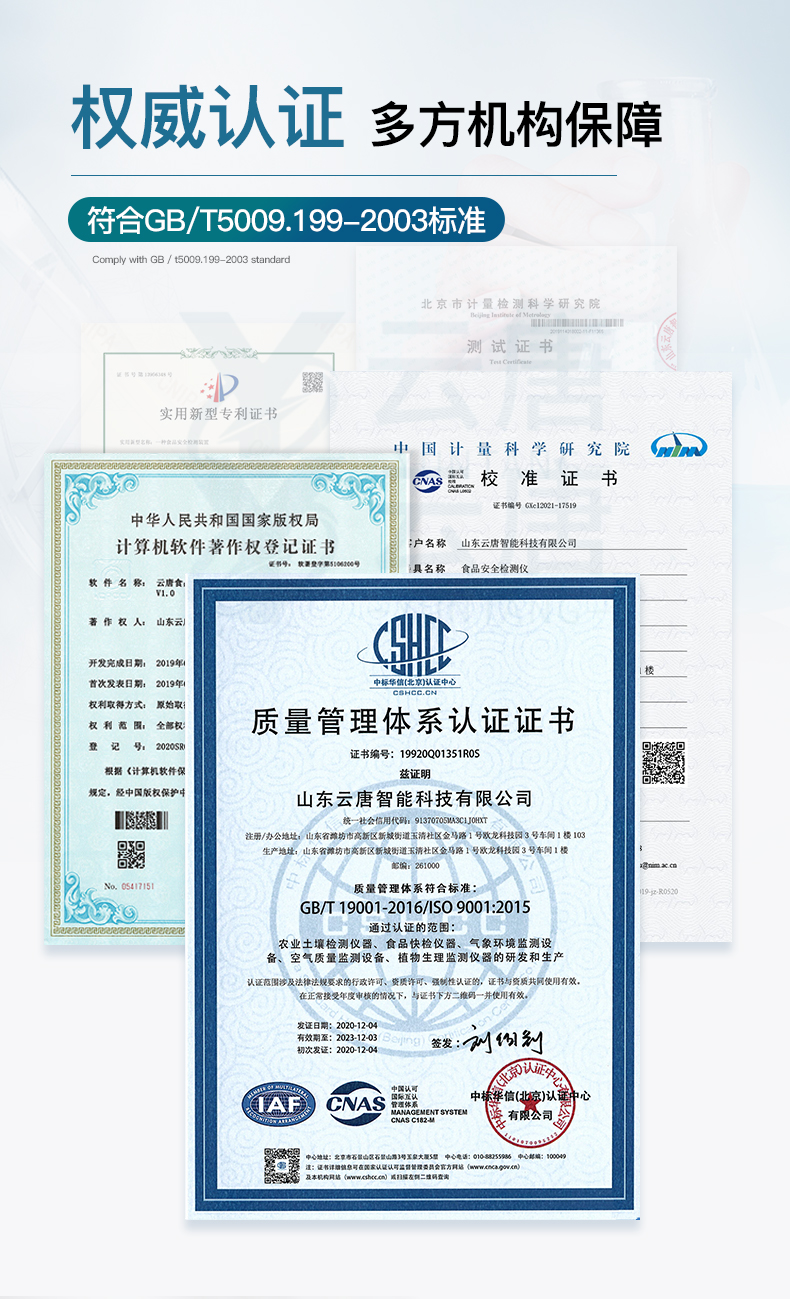 山東云唐智能科技有限公司生產(chǎn)的高智能食品安全檢測(cè)儀為集成化食品安全快速檢測(cè)分析設(shè)備,采用臺(tái)式一體化設(shè)計(jì),可快速檢測(cè)200多種食品安全項(xiàng)目,包含非食用化學(xué)物質(zhì)、濫用食品添加劑、農(nóng)藥殘留、獸藥殘留、重金屬、病害肉、營(yíng)養(yǎng)強(qiáng)化劑、抗生素類殘留、激素類殘留、真菌毒素類殘留、化學(xué)類殘留等項(xiàng)目的定性定量檢測(cè)。目前廣泛應(yīng)用于市場(chǎng)監(jiān)管局、檢測(cè)中心、衛(wèi)生監(jiān)督部門(mén)、農(nóng)業(yè)部門(mén)、院校及各單位食堂、食品肉產(chǎn)品深加工企業(yè)、商超市場(chǎng)、司法部門(mén)、餐飲機(jī)構(gòu)、養(yǎng)殖場(chǎng)、屠宰場(chǎng)、檢驗(yàn)檢疫部門(mén)等單位。