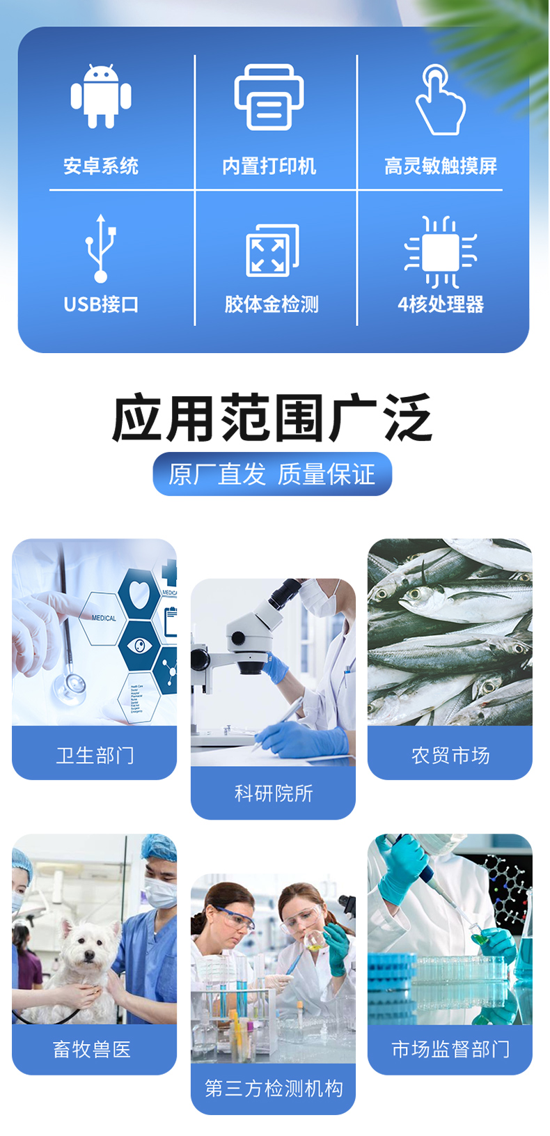該動物疫病診斷儀適用于豬、雞、鴨、羊、牛、牛奶等畜禽產(chǎn)品中動物疫病、獸藥殘留、有毒有害物質(zhì)和抗生素殘留的檢測可廣泛應(yīng)用于食藥監(jiān)局、衛(wèi)生部門、高教院校、科研院所、農(nóng)業(yè)部門、畜牧獸醫(yī)、養(yǎng)殖場、屠宰場、食品肉產(chǎn)品深加工企業(yè)、檢驗檢疫部門等單位使用。