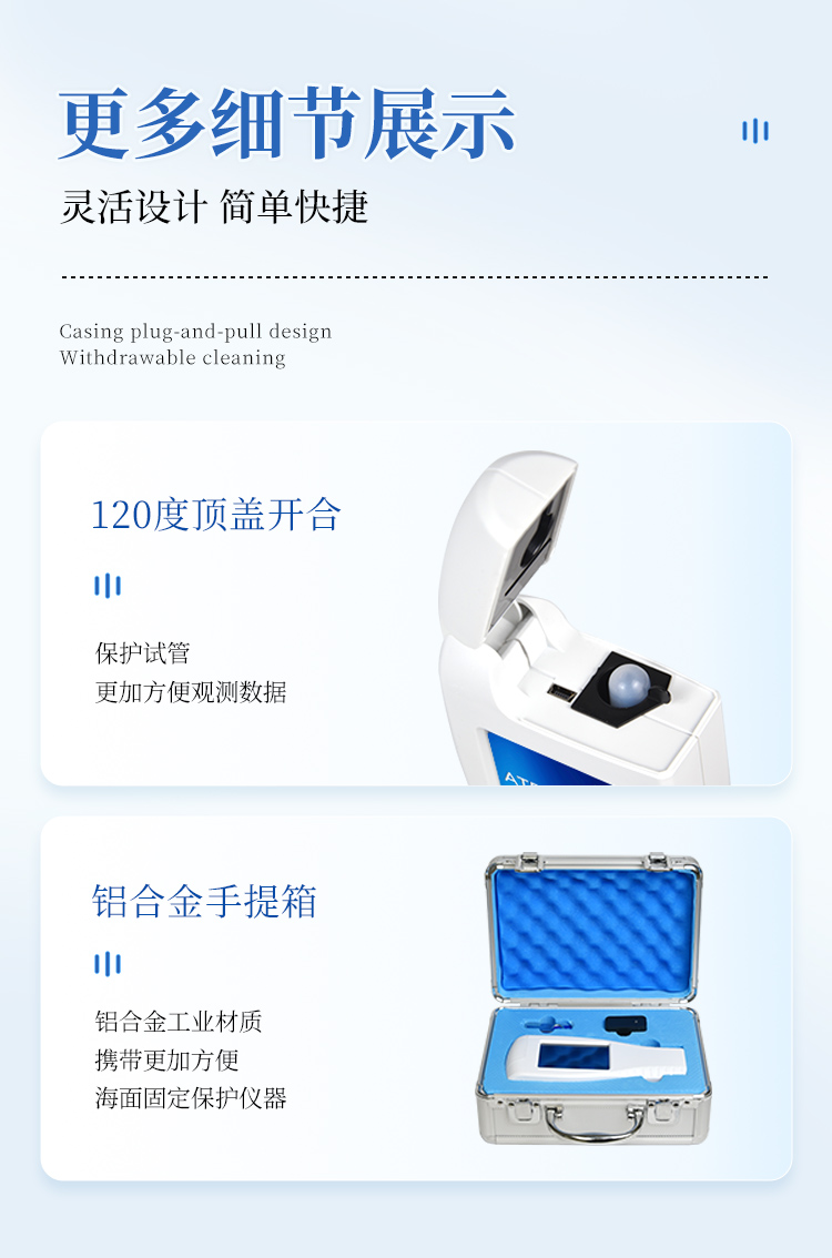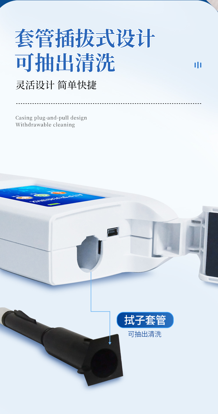 | 實用性 —— 可根據(jù)環(huán)境檢測需求設(shè)定上下限值,做到數(shù)據(jù)快速評估預(yù)警,表面潔凈度快速篩查。 | 靈敏度高 —— *************** | 速度快 —— 常規(guī)培養(yǎng)法18-24h以上,而ATP只需要十幾秒鐘 . | 可行性 —— 微生物數(shù)量與微生物體內(nèi)所含ATP有明確的相關(guān)性。 通過檢測ATP含量,可間接得出反應(yīng)中微生物數(shù)量 | 可操作性 —— 傳統(tǒng)培養(yǎng)方法需要在實驗室由經(jīng)過培訓(xùn)的技術(shù)人員進行操作;而ATP快速潔凈度檢測操作非常簡便,只需簡單的培訓(xùn)即可由一般工作人員進行現(xiàn)場操作。 | 體驗更好 —— 試子套管采用插拔式靈活設(shè)計,可定期清洗長期使用,延長儀器壽命。 |