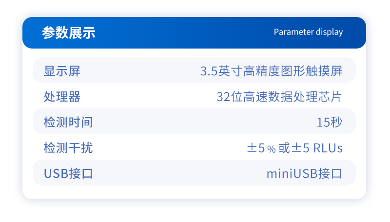 | 顯示屏:3.5英寸高精度圖形觸摸屏 | 處理器:32位高速數(shù)據(jù)處理芯片 | 檢測精度:********** | 大腸菌群:******** | 檢測范圍:*************** | 檢測時間:15秒 | 檢測干擾:±5﹪或±5 RLUs | 操作溫度范圍:5℃到40℃ | 操作濕度范圍:20—85﹪ | ATP回收率:90-110% | 檢出模式:RLU、大腸菌群篩查 | 50個用戶ID 設(shè)定 | 可設(shè)定的結(jié)果限值個數(shù):251個 | 自動判斷合格與不合格 | 自動統(tǒng)計合格率 | 內(nèi)置自校光源 | 開機30秒自檢 | 配有miniUSB接口,可將結(jié)果上傳至PC | 配備專用軟件驅(qū)動U盤代替?zhèn)鹘y(tǒng)光盤 | 儀器尺寸(W×H×D):188 mm×77mm×37mm | 使用可充電鋰電池免電池更換 | 備用狀態(tài)(20℃):6個月 | 中文操作手冊 | 穩(wěn)定的液體熒光素酶 | 潤濕的一體化采集拭子 |