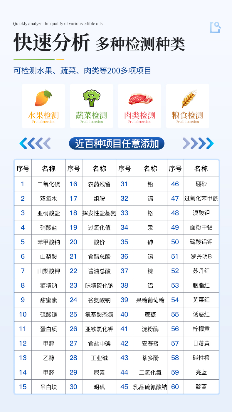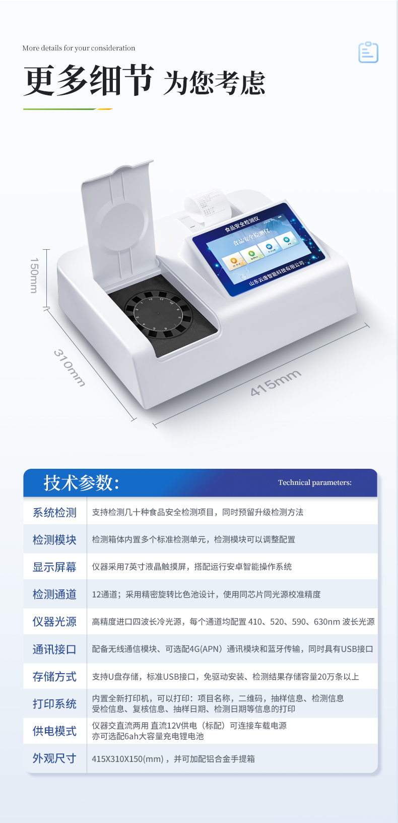 1、儀器采用臺式一體化系統(tǒng)檢測技術(shù),將分光光度模塊、數(shù)字化管理模塊、無線通訊模塊高度集成于一體,支持檢測幾十種食品安全檢測項(xiàng)目,同時預(yù)留升級檢測方法。