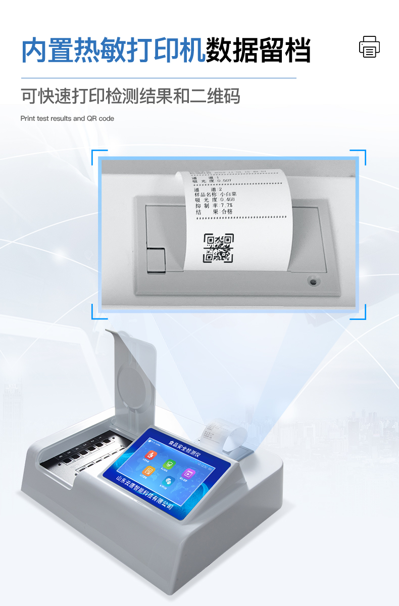 | 儀器采用臺式一體化系統(tǒng)檢測技術(shù),將分光光度模塊、新型農(nóng)殘檢測模塊、數(shù)字化管理模塊、無線通訊模塊高度集成于一體,支持檢測200種食品安全檢測項(xiàng)目,同時預(yù)留升級檢測方法。 | 儀器檢測模塊標(biāo)準(zhǔn)化、智能化,可隨意自由組合。檢測箱體內(nèi)置多個標(biāo)準(zhǔn)檢測單元,檢測模塊可以調(diào)整配置。 | 儀器采用全新安卓智能系統(tǒng),主控芯片采用 ARM Cortex-A7,RK3288/4核處理器,10.1寸高清液晶觸摸豎屏,更加**的UI交互界面,運(yùn)轉(zhuǎn)快捷;儀器配備無線通信模塊: 4G(APN)通訊模塊、Wifi模塊,藍(lán)牙傳輸,同時具有雙USB接口以及RJ45接口能以多種方式實(shí)現(xiàn)數(shù)據(jù)保存和數(shù)據(jù)傳輸功能。 | 創(chuàng)新檢測模式: | ★檢測通道:≥12通道;采用精密旋轉(zhuǎn)比色池設(shè)計(jì),使用同芯片同光源校準(zhǔn)精度,解決不同光源之間的誤差值。1-12通道間誤差0.1%。(***:**202022821055.2) | ★儀器具有自動識別比色皿檢測功能,即:將樣品比色皿放入儀器后,點(diǎn)擊樣品檢測,儀器自動識別比色皿進(jìn)行通道檢測。 | 進(jìn)口高精光源: | 高精度進(jìn)口四波長冷光源,通道配置 410、520、590、630nm 波長光源,一個光源芯片驅(qū)動一個光源,誤差極小,每臺設(shè)備單獨(dú)**校準(zhǔn)光源,**比對,同時參照四種不同波段光源全方位覆蓋市面上99%的農(nóng)殘食品項(xiàng)目檢測。 | 智能化操作系統(tǒng): | 便捷操作系統(tǒng):設(shè)備檢測時可在同一檢測界面自動對應(yīng)相關(guān)檢測通道一次性選擇1-12個樣品名稱,無須退出界面,節(jié)省操作時間。 | 數(shù)據(jù)集成系統(tǒng):設(shè)備首頁自動統(tǒng)計(jì)檢測數(shù)據(jù)包含:周檢測數(shù)據(jù)、月檢測數(shù)據(jù),全部檢測總數(shù)量,均包含檢測總數(shù),合格數(shù),不合格數(shù),以及相關(guān)柱形分析圖,對各項(xiàng)檢測數(shù)據(jù)清晰掌握,無需電腦查詢,更加快捷直觀。 | 項(xiàng)目預(yù)設(shè)系統(tǒng):支持添加單個及多個相同或不相同的任務(wù)預(yù)設(shè),一鍵快速調(diào)取,每一個任務(wù)分別可以設(shè)置不同的樣品、批次、編號、來源、備注、抽樣信息、檢測信息、受檢信息、復(fù)核信息等更多信息。無縫鏈接平臺和APP實(shí)時查看下發(fā)任務(wù)。 | 數(shù)據(jù)監(jiān)管系統(tǒng):同步對接監(jiān)管平臺,數(shù)據(jù)可局域網(wǎng)和互聯(lián)網(wǎng)數(shù)據(jù)上傳,檢測結(jié)果可選擇直接傳至食品安全監(jiān)管平臺。集成OSS輸出存儲服務(wù)、區(qū)分設(shè)備定向管理應(yīng)用,進(jìn)行區(qū)域食品安全監(jiān)管及大數(shù)據(jù)分析處理與數(shù)據(jù)統(tǒng)計(jì),檢測區(qū)域食品安全長短期動態(tài),達(dá)到食品安全問題預(yù)估、預(yù)警。 | 自定義打印系統(tǒng):內(nèi)置全新打印系統(tǒng),新創(chuàng)自定義打印方式,可按需靈活設(shè)置開啟或關(guān)閉:產(chǎn)品合格證(國家農(nóng)業(yè)部標(biāo)準(zhǔn)要求),二維碼,抽樣信息、檢測信息,受檢信息、復(fù)核信息、抽樣日期、檢測日期等信息的打印。 | 系統(tǒng)遠(yuǎn)程更新功能:可定向分客戶分儀器更新系統(tǒng),按照不同客戶后期實(shí)際需求添加項(xiàng)目,無需機(jī)器返廠,即可遠(yuǎn)程實(shí)時升級全新系統(tǒng),節(jié)省時間成本及避免運(yùn)輸造成設(shè)備損壞。 | 儀器主機(jī)采用一體化防水、抗壓、防撞擊、防腐蝕箱體設(shè)計(jì),同時配備交直流供電,可連接車載電源,可選配大容量充電鋰電池,滿足現(xiàn)場野外檢測需求。 | 安全證書,放心保障:儀器具有中國計(jì)量科學(xué)研究院校準(zhǔn)證書,權(quán)威認(rèn)證。 |