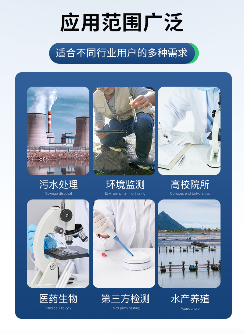 適用于純凈水廠、自來水廠、生活污水處理廠、工業(yè)污水、水產(chǎn)養(yǎng)殖、河流監(jiān)測、游泳場館、水源保護、生產(chǎn)監(jiān)測、科研實驗等。