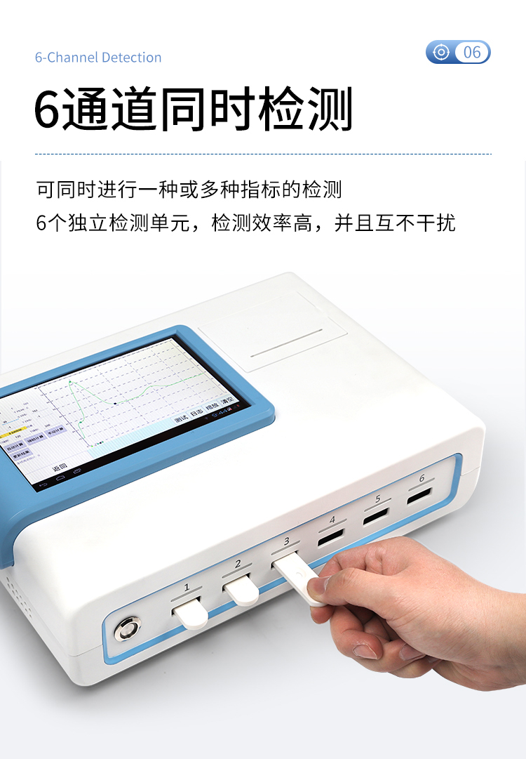 | 一體化設(shè)計(jì),集成孵育和檢測(cè)功能同時(shí)進(jìn)行,孵育完成直接檢測(cè); | 全中文 7英寸高清液晶顯示,觸摸屏操作; | Android 系統(tǒng),支持在線升級(jí),可WIFI聯(lián)網(wǎng); | 檢測(cè)原理:熒光定量免疫層析法; | 6通道設(shè)計(jì),可同時(shí)進(jìn)行一種或多種指標(biāo)的檢測(cè),6個(gè)獨(dú)立檢測(cè)單元,檢測(cè)效率高,并且互不干擾; | 具有二維碼自動(dòng)識(shí)別系統(tǒng),可直接識(shí)別檢測(cè)項(xiàng)目、檢測(cè)流程等信息; | 儀器自帶熱敏打印機(jī),檢測(cè)結(jié)果可實(shí)時(shí)打印; | 具有檢測(cè)數(shù)據(jù)存儲(chǔ)(存儲(chǔ)數(shù)量不少于 10000 條)、查詢(xún)、批量數(shù)據(jù)處理和打印功能; | 儀器≥2 個(gè)USB 接口,可拷貝結(jié)果及原始數(shù)據(jù),具有 wifi 接入模塊,可通過(guò)無(wú)線連接網(wǎng) 絡(luò)實(shí)現(xiàn)數(shù)據(jù)上傳; | 分鐘內(nèi)達(dá)到工作狀態(tài)(37℃),封閉系統(tǒng),不受外界環(huán)境(光、熱)干擾,工作環(huán)境溫度:0-30℃; | 相對(duì)極差≤10%; | 重復(fù)性 CV≤1%; | 批間變異≤3%; | 尺寸310x210x93mm |