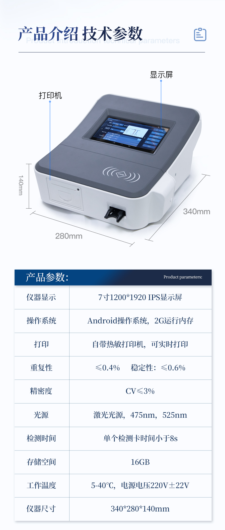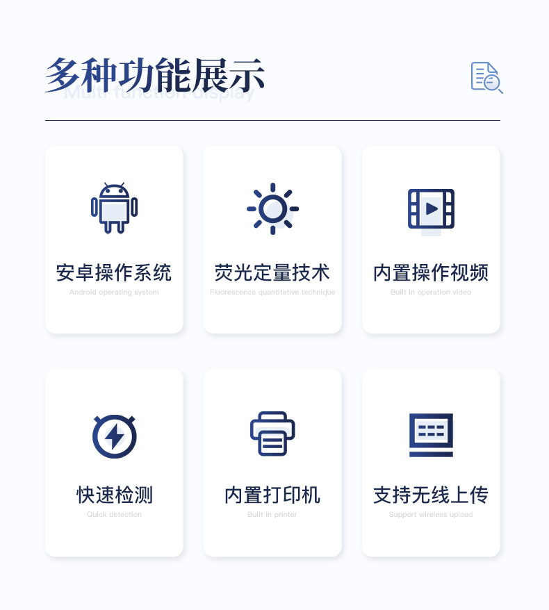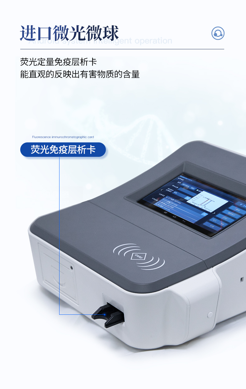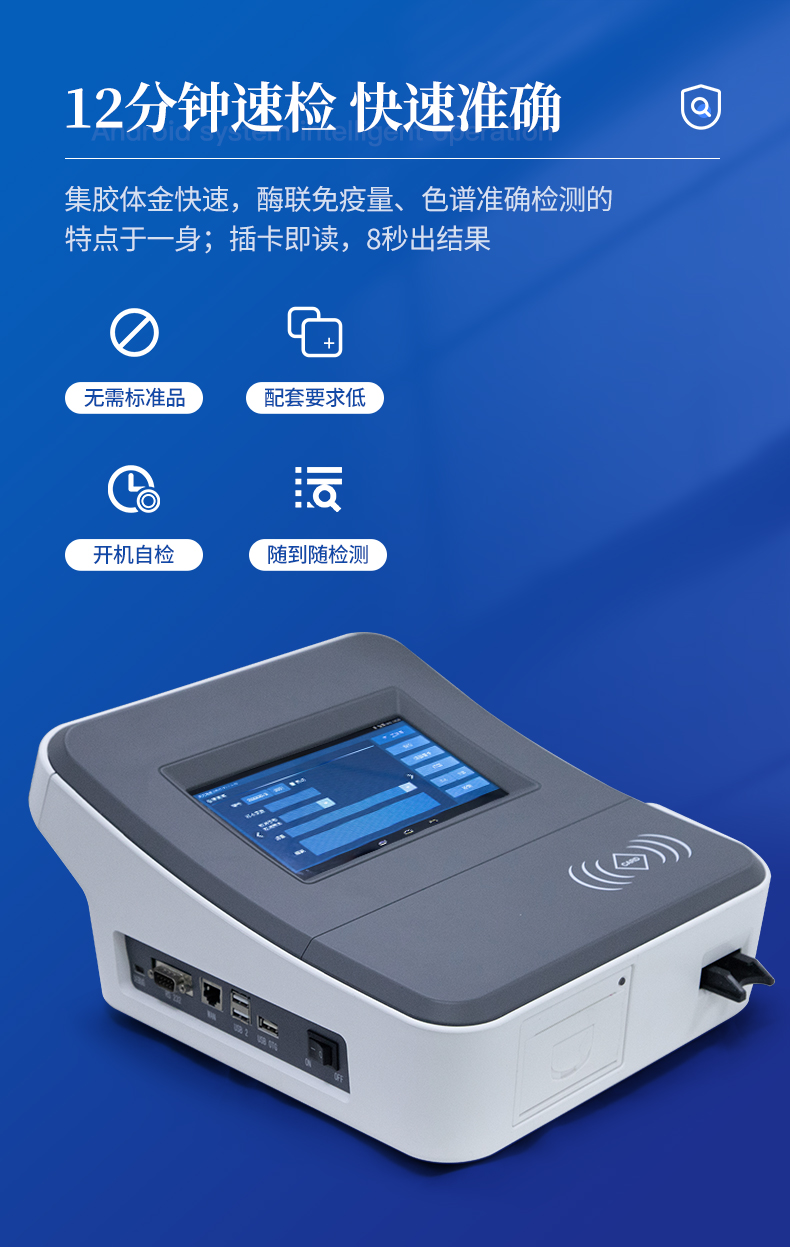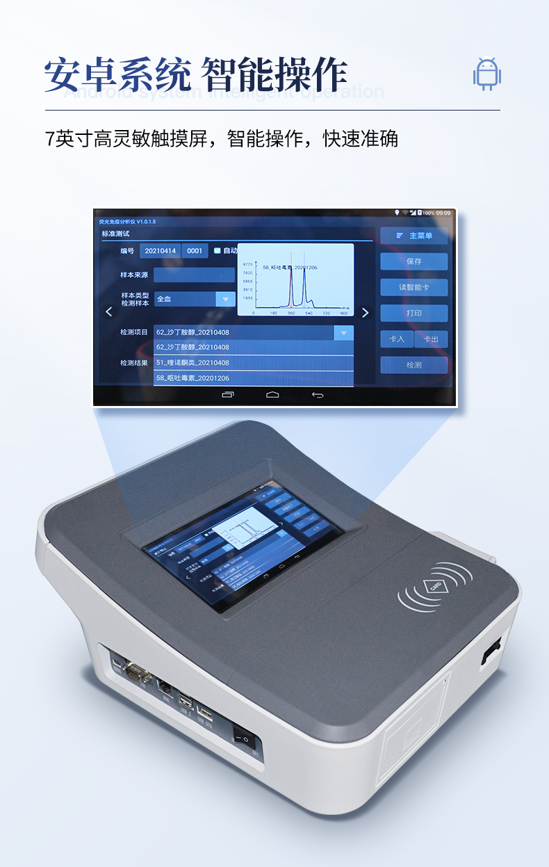1、儀器自動(dòng)識(shí)別檢測(cè)卡條形碼上的檢測(cè)項(xiàng)目、樣本類型、檢測(cè)限、標(biāo)準(zhǔn)曲線,形成完整的檢測(cè)數(shù)據(jù)信息鏈。一卡一控,插卡后儀器自動(dòng)讀取檢測(cè)卡顯示的C、T線的熒光信號(hào),依據(jù)檢測(cè)卡內(nèi)置的標(biāo)準(zhǔn)曲線,自動(dòng)計(jì)算結(jié)果;用戶可根據(jù)自身需求,選擇設(shè)定檢測(cè)限/定量限(內(nèi)控或國(guó)家標(biāo)準(zhǔn)限量)。2、檢測(cè)數(shù)據(jù)信息采集項(xiàng)目(包括但不限于):儀器至少支持以下檢測(cè)數(shù)據(jù)采集:①檢測(cè)項(xiàng)目;②樣本類型;③檢測(cè)樣本;④?chē)?guó)家限量;⑤檢測(cè)者;⑥檢測(cè)單位;⑦檢測(cè)時(shí)間;⑧檢測(cè)線/定量限;⑨檢測(cè)編號(hào);⑩內(nèi)控限量 樣本來(lái)源等,并支持?jǐn)?shù)據(jù)采集項(xiàng)目遠(yuǎn)程擴(kuò)展升級(jí)。3、檢測(cè)數(shù)據(jù)采集方式:檢測(cè)數(shù)據(jù)信息采集項(xiàng)目中載明的:①-⑨項(xiàng)為儀器自動(dòng)識(shí)別采集,⑩項(xiàng)為手寫(xiě)輸入。4、檢測(cè)數(shù)據(jù)上傳方式:完成檢測(cè)后,儀器能自動(dòng)將檢測(cè)數(shù)據(jù)信息采集項(xiàng)目載明的全部檢測(cè)數(shù)據(jù)信息上傳至檢測(cè)監(jiān)管系統(tǒng)平臺(tái)。5、接口:藍(lán)牙通訊接口;內(nèi)置無(wú)線WIFI,檢測(cè)數(shù)據(jù)實(shí)時(shí)傳輸?shù)綌?shù)據(jù)監(jiān)管平臺(tái),客戶可通過(guò)賬號(hào)登陸在網(wǎng)絡(luò)上實(shí)時(shí)查看檢測(cè)數(shù)據(jù)6、存儲(chǔ)空間:存儲(chǔ)空間16GB。7、信息輸入:支持中英文手寫(xiě)輸入。8、本機(jī)數(shù)據(jù)管理:具有檢測(cè)數(shù)據(jù)存儲(chǔ)、查詢,批量數(shù)據(jù)刪除和打印等功能。9、檢測(cè)項(xiàng)目管理:儀器支持檢測(cè)項(xiàng)目及對(duì)應(yīng)國(guó)家限量遠(yuǎn)程增加、刪除等維護(hù)管理。10、操作權(quán)限管理:儀器支持檢測(cè)操作人員使用賬號(hào)、密碼登陸儀器的功能,支持賬號(hào)、密碼在監(jiān)管系統(tǒng)平臺(tái)進(jìn)行驗(yàn)證。11、在線學(xué)習(xí):內(nèi)置檢測(cè)項(xiàng)目操作流程簡(jiǎn)圖,教學(xué)軟件可實(shí)時(shí)在線更新。12、工作溫度:5-40℃,相對(duì)濕度:10%-90%。電源電壓220V±22V,頻率50Hz±1Hz,額定功率40W,與電源的連接方式:可拆卸電源線。13、恒溫孵育器(1)適用于定量膠體金試紙卡和反應(yīng)液體準(zhǔn)確控溫反應(yīng),以提高準(zhǔn)確性;(2)孵育器卡槽數(shù)6個(gè),每個(gè)卡槽時(shí)間獨(dú)立控制;(3)插入卡條后自動(dòng)倒計(jì)時(shí),倒計(jì)時(shí)結(jié)束自動(dòng)報(bào)警,并記錄超時(shí)時(shí)間;(4)內(nèi)部恒溫控制,控溫溫度:37℃,控溫精度≤0.5℃,升溫速度≤8min,溫度均勻性≤0.3℃,實(shí)時(shí)溫度顯示精度:0.1℃。