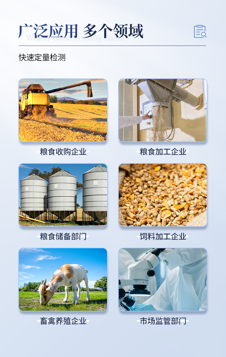 真菌毒素?zé)晒舛糠治鰞x可快速檢測(cè)糧食、飼料、谷物、食用油、調(diào)味品中如玉米、大米、小麥、大麥、糙米、麩皮、稻谷、豆粕、米糠、飼料中的黃曲霉毒素B1、黃曲霉毒素M1、玉米赤霉烯酮、嘔吐毒素、伏馬毒素,杜絕毒素污染,維護(hù)食品安全。