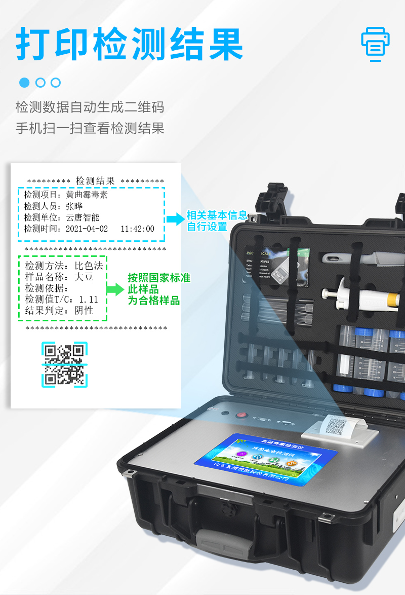 | 安卓智能操作系統(tǒng),采用更加**和人性化操作,儀器具有網(wǎng)線連接、wifi聯(lián)網(wǎng)上傳、GPRS無線遠傳功能,快速上傳數(shù)據(jù)。 | 一體化便攜式快檢設(shè)備,滿足現(xiàn)場及流動檢測使用需求,能夠在同一軟件下實現(xiàn)所有檢測項目的檢測,并可通過同一窗口直觀顯示檢測結(jié)果。 | 智能化程度高,儀器具有自檢功能:具有開機自檢和調(diào)零功能,具有自動檢測重復(fù)性功能。 | 檢測通道:≥12個檢測通道,可以同時測試多個樣品,每個樣品由程序控制分別獨立工作,不會互相干擾。 | 顯示方式:≥7英寸液晶觸摸屏顯示,人性化中文操作界面,讀數(shù)直觀、簡單。 | 配備新一代嵌入式熱敏打印機,可選擇手動打印或者自動打印,檢測完成可自動打印檢測報告和二維碼。 | 光源采用進口超高亮發(fā)光二極管,高精度、穩(wěn)定性強、光源可控、可以關(guān)掉不使用的光源,功耗更低。 | 采用USB2.0接口設(shè)計,方便數(shù)據(jù)的存貯和移動,并可隨時與計算機直接相連,并且可用計算機控制儀器。實現(xiàn)數(shù)據(jù)查詢、瀏覽、分析、統(tǒng)計、打印等。 | 儀器具有品類多種類樣品菜單庫,可靈活選擇檢測樣品,不同的檢測通道可同時檢測不同的樣品項目。 | 高靈敏度,高檢測精度,高重復(fù)性精度,掃描式高精度光學(xué)傳感器。 | 儀器具有重新校準、鎖定、恢復(fù)出廠設(shè)置功能。 | 結(jié)果判定線可修改,對照值標定值可保存,斷電不丟失數(shù)據(jù)。 |