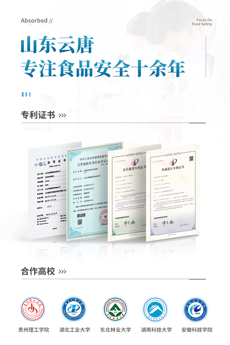 | 儀器采用手提箱一體化設(shè)計(jì),將分光光度模塊、膠體金檢測(cè)模塊、新型農(nóng)殘檢測(cè)模塊、數(shù)字化管理模塊、無(wú)線通訊模塊高度集成于一體,同時(shí)預(yù)留升級(jí)檢測(cè)方法,可遠(yuǎn)程進(jìn)行升級(jí)系統(tǒng)。 | 儀器檢測(cè)模塊標(biāo)準(zhǔn)化、智能化,檢測(cè)項(xiàng)目可隨意自由組合。檢測(cè)箱體內(nèi)置多個(gè)標(biāo)準(zhǔn)檢測(cè)單元,檢測(cè)模塊可以調(diào)整配置。 | 顯示屏幕:儀器采用10.1英寸豎向液晶觸摸屏顯,搭配運(yùn)行安卓智能操作系統(tǒng),主控芯片采用ARM Cortex-A7,RK3288/4核處理器,主頻1.88Ghz,操作方便,性能更強(qiáng)。 | 檢測(cè)通道:≥12通道;采用精密旋轉(zhuǎn)比色池設(shè)計(jì),使用同芯片同光源校準(zhǔn)精度,解決不同光源之間的誤差值,更加準(zhǔn)確**。(1-12通道間誤差0.1%,***:**202022821055.2) | 儀器光源:高精度進(jìn)口四波長(zhǎng)冷光源,每個(gè)通道均配置 410、520、590、630nm 波長(zhǎng)光源,標(biāo)配**的光路切換裝置,專利光路切換功能可實(shí)現(xiàn)64波長(zhǎng),并且所有檢測(cè)項(xiàng)目可實(shí)現(xiàn)所有通道同時(shí)檢測(cè)。 | 設(shè)備可一鍵校準(zhǔn),自動(dòng)保存校準(zhǔn)數(shù)據(jù),自動(dòng)對(duì)比校驗(yàn),得到精準(zhǔn)光源,采用Android SP存儲(chǔ)數(shù)據(jù),光源數(shù)據(jù)永不丟失,方便每一次使用。 | 通訊接口:配備無(wú)線通信模塊、4G(APN)通訊模塊、藍(lán)牙傳輸,同時(shí)具有雙USB接口以及RJ45網(wǎng)線接口,可以多方式實(shí)現(xiàn)數(shù)據(jù)保存及數(shù)據(jù)傳輸。 | 存儲(chǔ)方式:支持U盤存儲(chǔ),標(biāo)準(zhǔn)USB接口,免驅(qū)動(dòng)安裝。檢測(cè)結(jié)果存儲(chǔ)容量20萬(wàn)條以上,可生成Excel表格進(jìn)行拷貝,并具有登錄保護(hù)功能。 | 操作系統(tǒng):儀器可在同一檢測(cè)界面自動(dòng)對(duì)應(yīng)相關(guān)檢測(cè)通道,一次性選擇1-12個(gè)樣品名稱,無(wú)需退出界面,節(jié)省操作時(shí)間。并可以對(duì)每個(gè)通道屬性和樣品信息單獨(dú)進(jìn)行編輯,例如送檢單位、人員,檢測(cè)人員等,打印時(shí)勾選打印顯示。 | 數(shù)據(jù)集成系統(tǒng):設(shè)備首頁(yè)自動(dòng)匯總分析檢測(cè)數(shù)據(jù),包含:周檢測(cè)數(shù)據(jù)、月檢測(cè)數(shù)據(jù),全部檢測(cè)總數(shù)量,包含檢測(cè)總數(shù),合格數(shù),不合格數(shù),以及相關(guān)柱形分析圖,各項(xiàng)檢測(cè)數(shù)據(jù)一目了然,無(wú)需電腦查詢,更加快捷直觀。 | 數(shù)據(jù)庫(kù)系統(tǒng):十幾項(xiàng)數(shù)據(jù)庫(kù)分類管理儀器:包含項(xiàng)目類型、項(xiàng)目數(shù)據(jù)、檢測(cè)數(shù)據(jù)、歷史記錄、國(guó)標(biāo)信息、曲線信息、采樣信息、檢測(cè)信息、受檢信息、復(fù)核信息、圖表信息、光源校準(zhǔn)信息、打印樣式信息、樣品庫(kù)信息等等,數(shù)據(jù)庫(kù)之間互相協(xié)調(diào)聯(lián)動(dòng)保證數(shù)據(jù)的真實(shí)完整性。同時(shí)產(chǎn)品數(shù)據(jù)庫(kù)以及歷史檢測(cè)記錄支持一鍵檢索功能。 | 限量規(guī)判系統(tǒng):具有限量查詢、添加物質(zhì)合規(guī)判定系統(tǒng)。檢測(cè)出結(jié)果后,系統(tǒng)自動(dòng)調(diào)用系統(tǒng)數(shù)據(jù)庫(kù)中相關(guān)國(guó)標(biāo)進(jìn)行比對(duì)判定,客觀顯示判定結(jié)果是否合格。 | 項(xiàng)目預(yù)設(shè)系統(tǒng):儀器具有任務(wù)預(yù)設(shè)模塊,一鍵提前預(yù)設(shè),給出方便快捷的新檢測(cè)方案,每一個(gè)任務(wù)分別可以設(shè)置不同的樣品、批次、編號(hào)、來(lái)源、備注、抽樣信息、檢測(cè)信息、受檢信息、復(fù)核信息等更多信息。樣品送檢時(shí)一鍵調(diào)取保存信息,并可多次調(diào)取,大大提高檢測(cè)效率。 | 數(shù)據(jù)監(jiān)管系統(tǒng):同步對(duì)接監(jiān)管平臺(tái),數(shù)據(jù)可局域網(wǎng)和互聯(lián)網(wǎng)數(shù)據(jù)上傳,檢測(cè)結(jié)果可直接傳至食品安全監(jiān)管平臺(tái)。進(jìn)行區(qū)域食品安全監(jiān)管及大數(shù)據(jù)分析處理與數(shù)據(jù)統(tǒng)計(jì),監(jiān)測(cè)區(qū)域食品安全長(zhǎng)短期動(dòng)態(tài)及問(wèn)題預(yù)估、預(yù)警。 | 全新打印系統(tǒng):內(nèi)置全新打印機(jī),新創(chuàng)自定義打印方式,可按需靈活勾選控制:產(chǎn)品合格證(國(guó)家農(nóng)業(yè)部標(biāo)準(zhǔn)要求),二維碼,抽樣信息、檢測(cè)信息,受檢信息、復(fù)核信息、抽樣日期、檢測(cè)日期等信息的打印。 | A4紙版本報(bào)告打印功能(可選配):設(shè)備擁有兩種結(jié)果展示方式,可以自動(dòng)生成A4打印模板和小票打印模板兩種樣式,可通過(guò)WiFi及網(wǎng)線等方式鏈接外置打印機(jī)可進(jìn)行打印。 | 供電模式:儀器交直流兩用,直流12V供電,可連接車載電源,配6ah大容量充電鋰電池,電量可實(shí)時(shí)顯示,方便戶外流動(dòng)測(cè)試。 | 膠體金檢測(cè)模塊:采用CMOS成像處理技術(shù)及膠體金免疫層析技術(shù),可讀取膠體金卡數(shù)據(jù),自動(dòng)采集、處理分析,將檢測(cè)結(jié)果顯示,并可根據(jù)參考限值自動(dòng)判斷檢測(cè)結(jié)果,可檢測(cè)常見(jiàn)的獸藥殘留、生物毒素、抗生素、違禁添加物等。