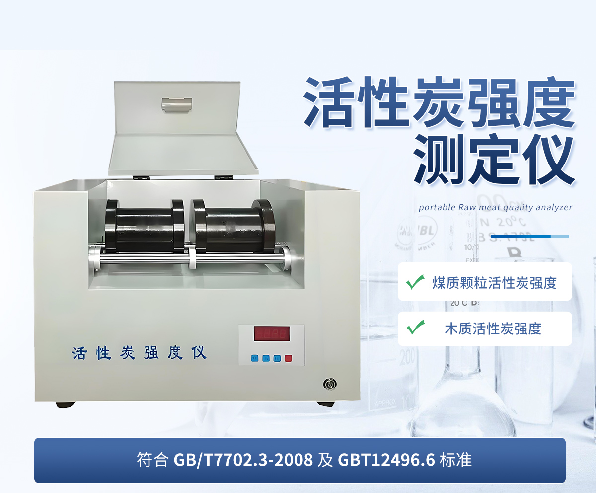 活性炭強度測定儀儀按照規(guī)定的試驗條件,將活性炭試料置于裝有鋼球的滾筒中,開啟強度測定儀,開始計時,通過滾筒的機械運動,試料被磨損,測定被破壞試料粒度的變化情況,用保留在試驗篩上的試料質(zhì)量占原試料的質(zhì)量分?jǐn)?shù),可求出活性炭試樣的強度。