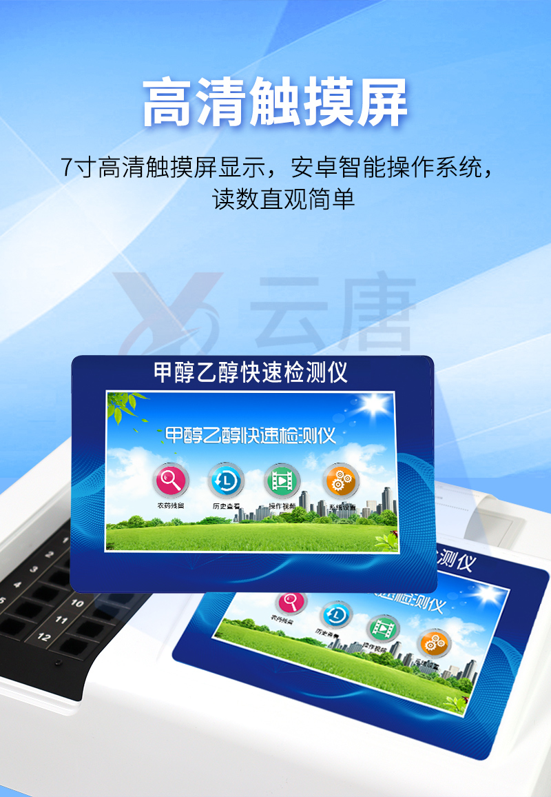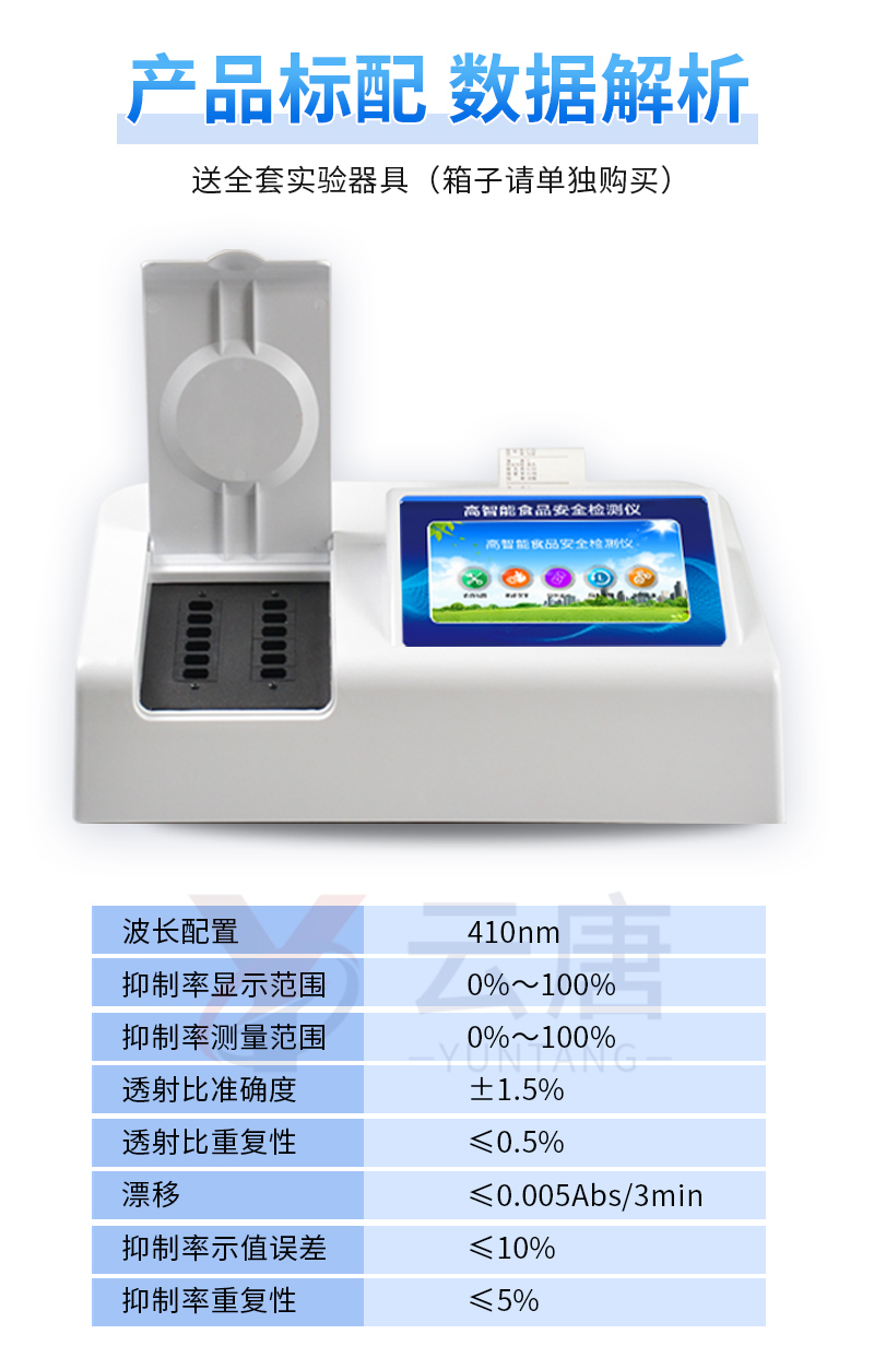 儀器采用臺(tái)式一體化系統(tǒng)檢測技術(shù),將分光光度模塊、新型農(nóng)殘檢測模塊、數(shù)字化管理模塊、無線通訊模塊高度集成于一體,支持檢測200種食品安全檢測項(xiàng)目,同時(shí)預(yù)留升級(jí)檢測方法。儀器檢測模塊標(biāo)準(zhǔn)化、智能化,可隨意自由組合。檢測箱體內(nèi)置多個(gè)標(biāo)準(zhǔn)檢測單元,檢測模塊可以調(diào)整配置。儀器采用全新安卓智能系統(tǒng),主控芯片采用 ARM Cortex-A7,RK3288/4核處理器,10.1寸高清液晶觸摸豎屏,更加**的UI交互界面,運(yùn)轉(zhuǎn)快捷;儀器配備無線通信模塊: 4G(APN)通訊模塊、Wifi模塊,藍(lán)牙傳輸,同時(shí)具有雙USB接口以及RJ45接口能以多種方式實(shí)現(xiàn)數(shù)據(jù)保存和數(shù)據(jù)傳輸功能。創(chuàng)新檢測模式:★檢測通道:≥12通道;采用精密旋轉(zhuǎn)比色池設(shè)計(jì),使用同芯片同光源校準(zhǔn)精度,解決不同光源之間的誤差值。1-12通道間誤差0.1%。(***:**202022821055.2)★儀器具有自動(dòng)識(shí)別比色皿檢測功能,即:將樣品比色皿放入儀器后,點(diǎn)擊樣品檢測,儀器自動(dòng)識(shí)別比色皿進(jìn)行通道檢測。進(jìn)口高精光源:高精度進(jìn)口四波長冷光源,通道配置 410、520、590、630nm 波長光源,一個(gè)光源芯片驅(qū)動(dòng)一個(gè)光源,誤差極小,每臺(tái)設(shè)備單獨(dú)**校準(zhǔn)光源,**比對,同時(shí)參照四種不同波段光源全方位覆蓋市面上99%的農(nóng)殘食品項(xiàng)目檢測。智能化操作系統(tǒng):便捷操作系統(tǒng):設(shè)備檢測時(shí)可在同一檢測界面自動(dòng)對應(yīng)相關(guān)檢測通道一次性選擇1-12個(gè)樣品名稱,無須退出界面,節(jié)省操作時(shí)間。數(shù)據(jù)集成系統(tǒng):設(shè)備首頁自動(dòng)統(tǒng)計(jì)檢測數(shù)據(jù)包含:周檢測數(shù)據(jù)、月檢測數(shù)據(jù),全部檢測總數(shù)量,均包含檢測總數(shù),合格數(shù),不合格數(shù),以及相關(guān)柱形分析圖,對各項(xiàng)檢測數(shù)據(jù)清晰掌握,無需電腦查詢,更加快捷直觀。項(xiàng)目預(yù)設(shè)系統(tǒng):支持添加單個(gè)及多個(gè)相同或不相同的任務(wù)預(yù)設(shè),一鍵快速調(diào)取,每一個(gè)任務(wù)分別可以設(shè)置不同的樣品、批次、編號(hào)、來源、備注、抽樣信息、檢測信息、受檢信息、復(fù)核信息等更多信息。無縫鏈接平臺(tái)和APP實(shí)時(shí)查看下發(fā)任務(wù)。數(shù)據(jù)監(jiān)管系統(tǒng):同步對接監(jiān)管平臺(tái),數(shù)據(jù)可局域網(wǎng)和互聯(lián)網(wǎng)數(shù)據(jù)上傳,檢測結(jié)果可選擇直接傳至食品安全監(jiān)管平臺(tái)。集成OSS輸出存儲(chǔ)服務(wù)、區(qū)分設(shè)備定向管理應(yīng)用,進(jìn)行區(qū)域食品安全監(jiān)管及大數(shù)據(jù)分析處理與數(shù)據(jù)統(tǒng)計(jì),檢測區(qū)域食品安全長短期動(dòng)態(tài),達(dá)到食品安全問題預(yù)估、預(yù)警。自定義打印系統(tǒng):內(nèi)置全新打印系統(tǒng),新創(chuàng)自定義打印方式,可按需靈活設(shè)置開啟或關(guān)閉:產(chǎn)品合格證(國家農(nóng)業(yè)部標(biāo)準(zhǔn)要求),二維碼,抽樣信息、檢測信息,受檢信息、復(fù)核信息、抽樣日期、檢測日期等信息的打印。系統(tǒng)遠(yuǎn)程更新功能:可定向分客戶分儀器更新系統(tǒng),按照不同客戶后期實(shí)際需求添加項(xiàng)目,無需機(jī)器返廠,即可遠(yuǎn)程實(shí)時(shí)升級(jí)全新系統(tǒng),節(jié)省時(shí)間成本及避免運(yùn)輸造成設(shè)備損壞。儀器主機(jī)采用一體化防水、抗壓、防撞擊、防腐蝕箱體設(shè)計(jì),同時(shí)配備交直流供電,可連接車載電源,可選配大容量充電鋰電池,滿足現(xiàn)場野外檢測需求。安全證書,放心保障:儀器具有中國計(jì)量科學(xué)研究院校準(zhǔn)證書,權(quán)威認(rèn)證。