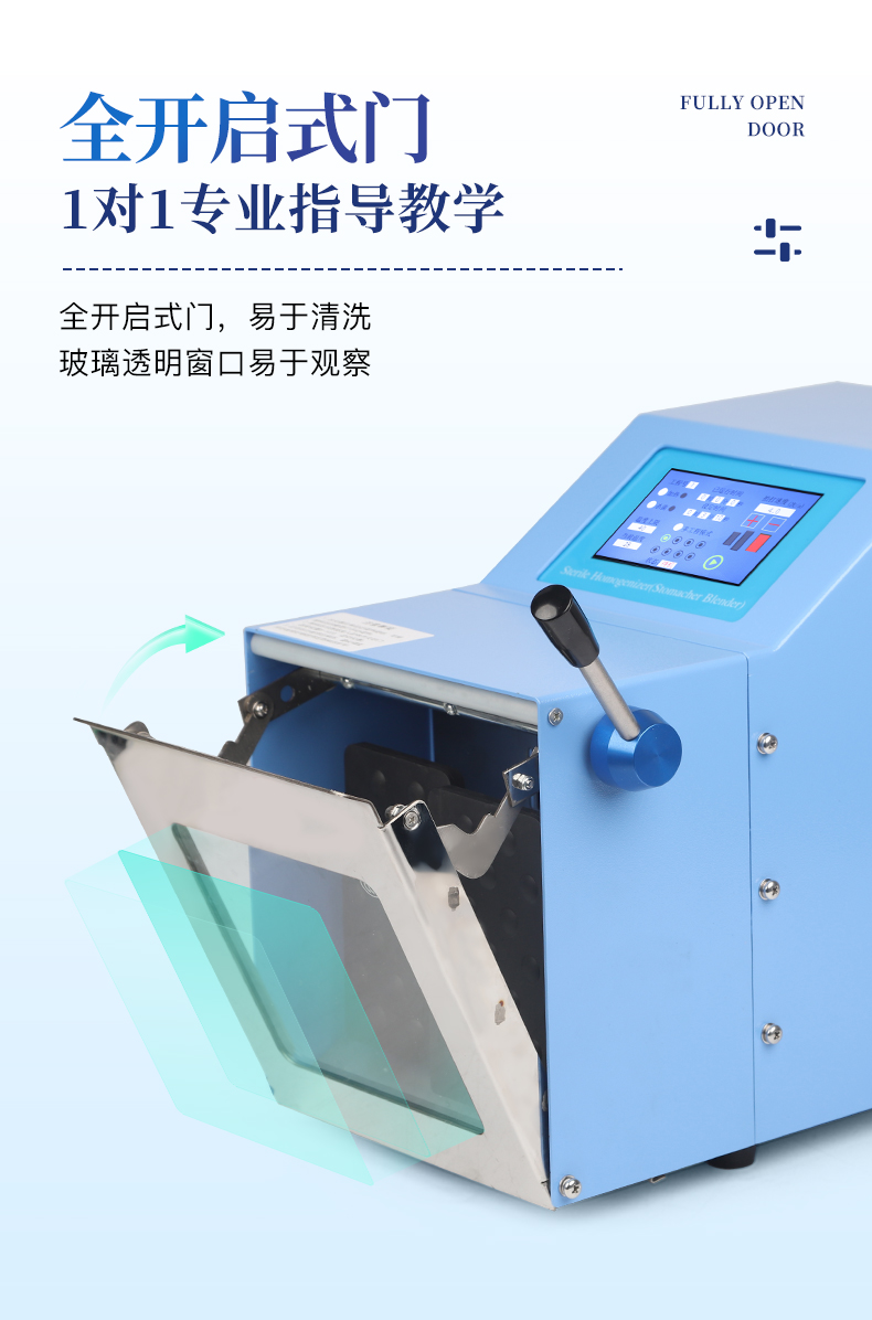 ●5英寸液晶顯示屏。    ●可儲存三組工作程序。    ●可調(diào)整的均質(zhì)時間。    ●均質(zhì)速度可調(diào)節(jié)或固定。    ●拍擊器可調(diào)整前后距離。    ●無菌一次性濾袋,保證衛(wèi)生。    ●全開啟式門,易于清洗。    ●玻璃透明窗口易于觀察 。    ●樣品與均質(zhì)儀無接觸,如無樣品泄露則不需進行系統(tǒng)清洗.    ●均質(zhì)柔和、樣品零污染、無損傷、不升溫、不需要滅菌處理,不需洗刷器皿。