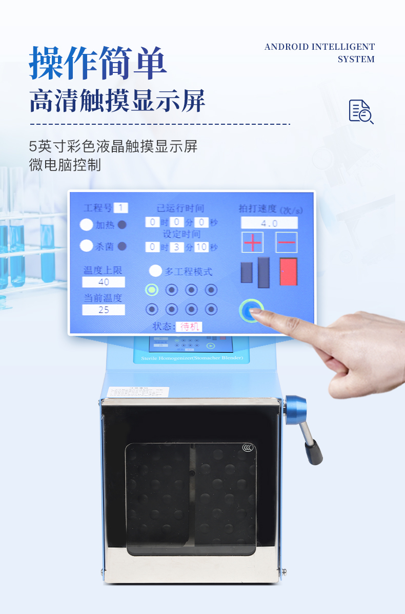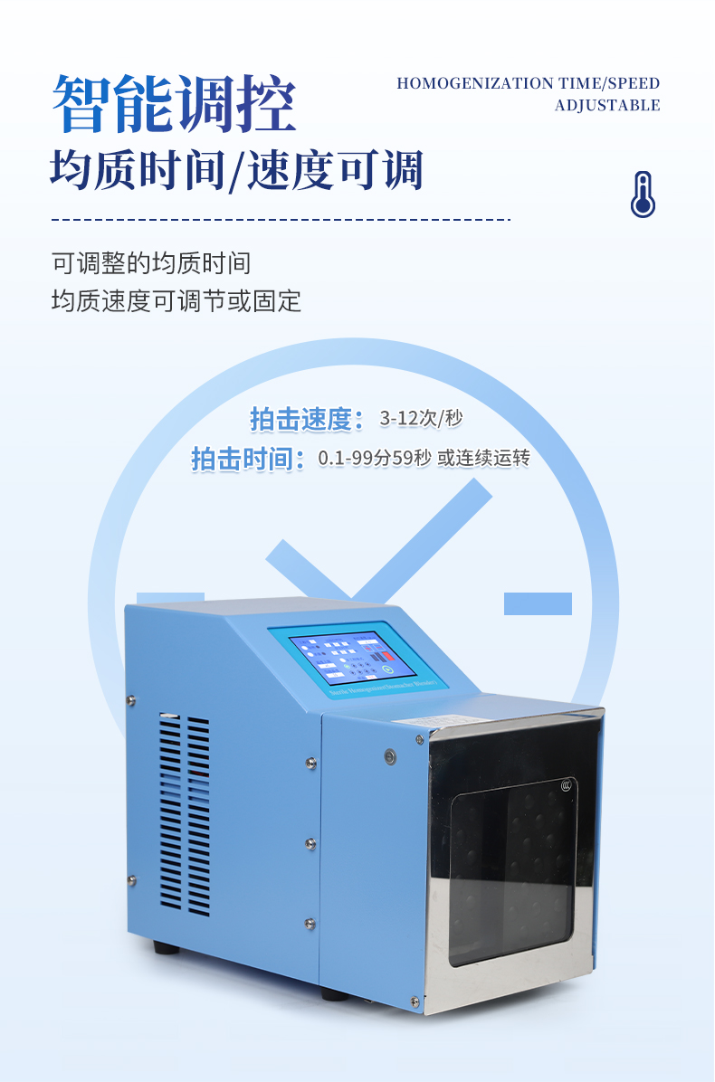 ●5英寸液晶顯示屏。 ●可儲(chǔ)存三組工作程序。 ●可調(diào)整的均質(zhì)時(shí)間。 ●均質(zhì)速度可調(diào)節(jié)或固定。 ●拍擊器可調(diào)整前后距離。 ●無菌一次性濾袋,保證衛(wèi)生。 ●全開啟式門,易于清洗。 ●玻璃透明窗口易于觀察 。 ●樣品與均質(zhì)儀無接觸,如無樣品泄露則不需進(jìn)行系統(tǒng)清洗. ●均質(zhì)柔和、樣品零污染、無損傷、不升溫、不需要滅菌處理,不需洗刷器皿。