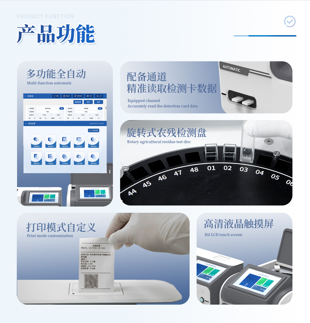 1. 試劑位置:3個2. 農(nóng)殘檢測盤:旋轉(zhuǎn)24通道比色盤,可任意選擇檢測通道,自動對應(yīng)選擇通道。3. 膠體金通道:2個,可讀取檢測卡結(jié)果,自動采集、處理分析,自動判斷檢測結(jié)果,并具備自動判空功能。4.系統(tǒng)配置:10.1寸高清液晶觸摸屏,采用ARM Cortex?-A7,RK3288/4核處理器,運行內(nèi)存1GB。Android7.1.1 系統(tǒng)分辨率1280×800。5.恒溫系統(tǒng):具有自動加溫溫控系統(tǒng),精準(zhǔn)恒溫37℃,精度±0.1℃。 6.添加系統(tǒng):儀器按照試劑要求自動、按時、按量加入試劑,并且自動對未正常放置的樣本或異常的樣本進行檢查并提示。7.清洗功能:儀器具備回流及自動清洗管路功能,避免試劑污染。8.混勻功能:設(shè)備具備自動混勻功能。9.光源校準(zhǔn):設(shè)備可自動校準(zhǔn),確保檢測準(zhǔn)確度。10.實時監(jiān)控:儀器測試過程中屏幕顯示運行狀態(tài),可實時查看。11.數(shù)據(jù)存儲:內(nèi)部存儲16GB,可存儲500萬條數(shù)據(jù)。12.樣品多選功能:設(shè)備具備樣品一鍵多選功能,選擇樣品自動匹配檢測通道。13.項目預(yù)設(shè):可提前設(shè)置單個及多個相同或不相同的檢測任務(wù),可單次或者多次調(diào)取,減少檢測時間。14.自定義打印系統(tǒng):內(nèi)置自定義打印系統(tǒng),可按需靈活設(shè)置開啟或關(guān)閉:產(chǎn)品合格證(國家農(nóng)業(yè)部標(biāo)準(zhǔn)),二維碼,抽樣信息、檢測信息,受檢信息等信息的打印。15.A4版本報告打印功能:設(shè)備可自動生成A4版報告,A4報告帶二維碼,可掃描二維碼生成電子版,并可識別真?zhèn)巍?/td>16.傳輸方式:儀器配備無線通信模塊: 4G(APN)通訊模塊、Wifi模塊,藍(lán)牙傳輸模塊,同時具有USB接口以及RJ45接口能以多種方式實現(xiàn)數(shù)據(jù)保存和數(shù)據(jù)傳輸功能,設(shè)備數(shù)據(jù)可以同步上傳至平臺。17.系統(tǒng)17.數(shù)據(jù)監(jiān)管系統(tǒng):設(shè)備自帶監(jiān)管平臺,并可同步對接監(jiān)管平臺,數(shù)據(jù)可局域網(wǎng)和互聯(lián)網(wǎng)數(shù)據(jù)上傳,檢測結(jié)果可直接傳至食品安全監(jiān)管平臺。達(dá)到食品安全問題預(yù)估、預(yù)警。18.系統(tǒng)遠(yuǎn)程更新功能:無需設(shè)備返廠,即可遠(yuǎn)程實時升級全新系統(tǒng),節(jié)省時間成本及避免運輸造成設(shè)備損。