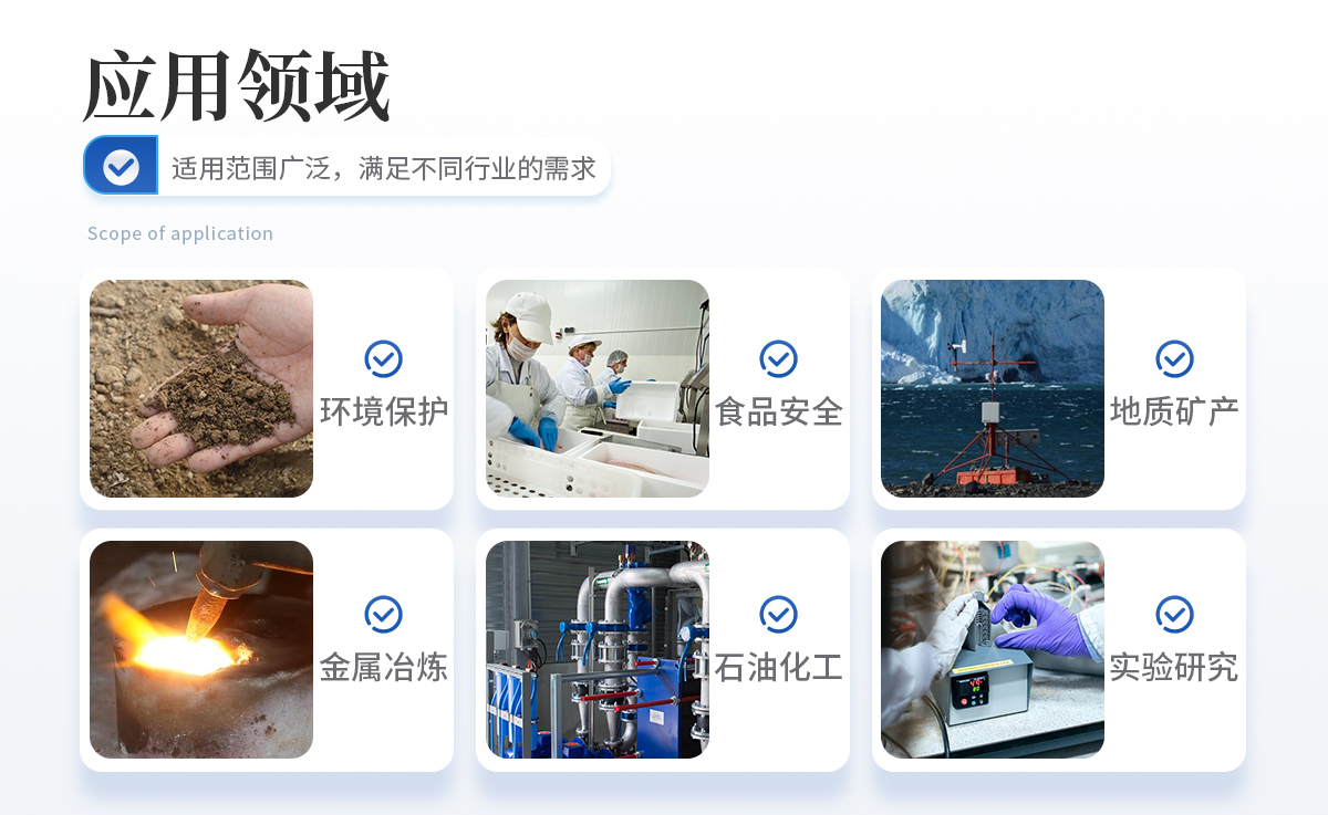 原子熒光光譜儀的應(yīng)用領(lǐng)域較為廣泛,主要測試樣品中 11 種超痕量元素的含量,**檢測下限可達千億分之一級。應(yīng)用領(lǐng)域包括水質(zhì)、土壤、大氣等樣環(huán)境檢測項目、食品檢驗、檢驗檢疫、藥品檢驗、化妝品檢驗、土壤飼料肥料檢驗、地質(zhì)礦產(chǎn)測試、冶金樣品檢驗、教學(xué)研究等。