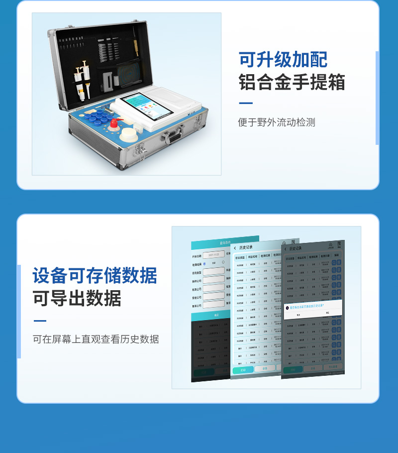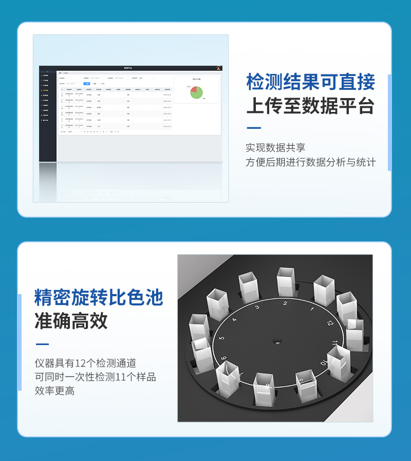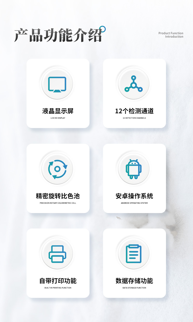| 該儀器采用ARM Cortex-A7,RK3288/4核處理器,搭配運行安卓智能操作系統(tǒng),集實驗操作,分析結(jié)果,打印報告等功能于一體,使用方便,性能更強(qiáng)。 | 儀器采用7.1英寸液晶觸摸屏,單機(jī)即可操作,無需連接外部顯示設(shè)備或控制裝置。 | 設(shè)備具有12個檢測通道,可一次性檢測11個樣品,效率更高。 | 儀器采用精密旋轉(zhuǎn)比色池設(shè)計,使用同光源校準(zhǔn)精度,檢測結(jié)果更為準(zhǔn)確**。 | 設(shè)備具有數(shù)據(jù)存儲功能,設(shè)備可以存儲數(shù)據(jù)100000組,可在屏幕上直觀查看歷史數(shù)據(jù),可導(dǎo)出數(shù)據(jù)。 | 設(shè)備自帶打印功能,可對樣品信息及檢測結(jié)果無限次隨意打印。 | 該儀器模塊化高度集成,同步設(shè)有數(shù)字化管理模塊、無線通訊模塊,可將檢測結(jié)果進(jìn)行分析,直接上傳至數(shù)據(jù)平臺,實現(xiàn)數(shù)據(jù)共享,方便后期進(jìn)行數(shù)據(jù)分析與統(tǒng)計。 | 儀器采用高度智能化系統(tǒng),儀器自動對檢測結(jié)果與國標(biāo)限量值進(jìn)行對比,自動判定樣品是否合格,結(jié)果更為直觀。 | 本設(shè)備可以針對檢測樣品信息,對每個通道屬性單獨進(jìn)行編輯,例如受檢單位,檢測人員等。 | 設(shè)備具有過壓保護(hù)、防靜電干擾、防磁場干擾等功能 | 該設(shè)備可進(jìn)行技術(shù)性遠(yuǎn)程升級,更新程序,無需返廠,并且后期我司將持續(xù)免費更新系統(tǒng)版本,降低使用成本及運輸損耗風(fēng)險。 |