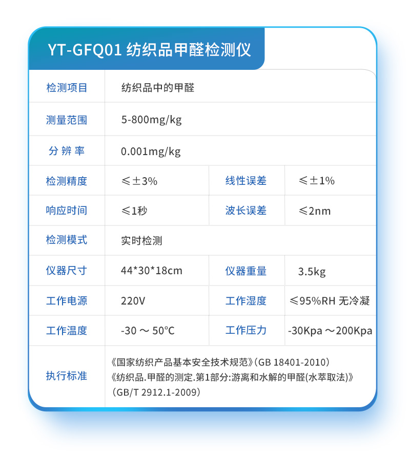 | 紡織品中的甲醛 | 5-800mg/kg | 0.001mg/kg | ≤±3% | ≤1秒 | 實時檢測 | 44*30*18cm | 220V | -30 ~ 50℃ | -30Kpa ~ 200Kpa | ≤±1% | ≤2nm | 3.5kg | ≤95%RH,無冷凝 | 《國家紡織產(chǎn)品基本安全技術(shù)規(guī)范》(GB 18401-2010) 《紡織品.甲醛的測定.第1部分:游離和水解的甲醛(水萃取法)》(GB/T 2912.1-2009) |