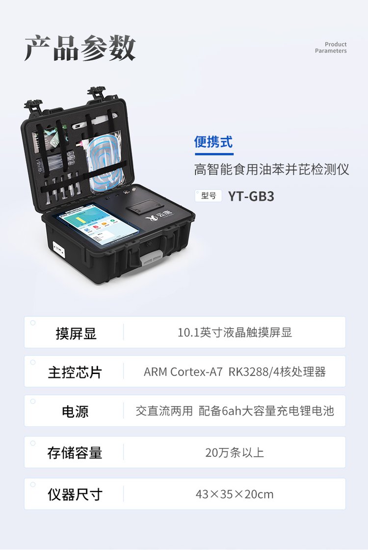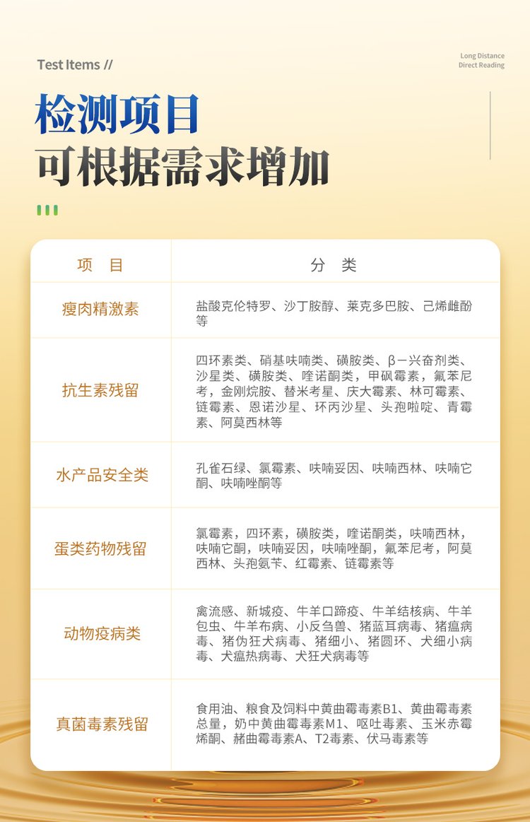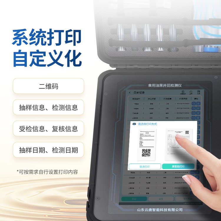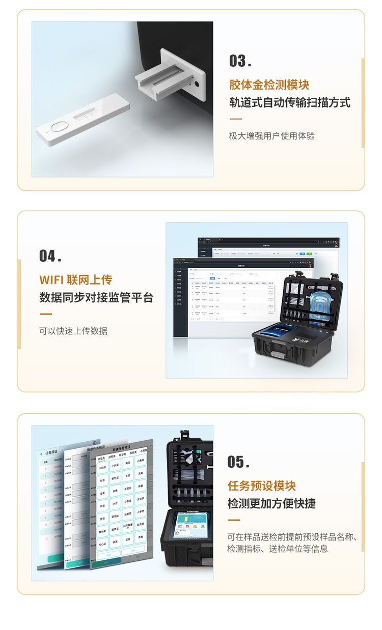 | 儀器采用10.1英寸液晶觸摸屏顯,搭配運(yùn)行安卓智能操作系統(tǒng),主控芯片采用ARM Cortex-A7,RK3288/4核處理器,主頻1.88Ghz,運(yùn)轉(zhuǎn)速度更快速,性能更強(qiáng)。 | 儀器功能包括:膠體金檢測(cè)模塊、數(shù)字化管理模塊、無(wú)線通訊模塊等,可以滿足同一軟件下實(shí)現(xiàn)所有檢測(cè)項(xiàng)目的檢測(cè),并在同一窗口展示檢測(cè)結(jié)果。 | 一體化便攜式快檢設(shè)備,采用交直流兩用供電方式,可連接車載電源,配備6ah大容量充電鋰電池,可以滿足現(xiàn)場(chǎng)及流動(dòng)檢測(cè)使用的需求。儀器尺寸:43×35×20cm, 主機(jī)凈重:5.1kg | ★系統(tǒng)自帶數(shù)據(jù)集成模塊,設(shè)備首頁(yè)自動(dòng)統(tǒng)計(jì)檢測(cè)數(shù)據(jù)包含:周檢測(cè)數(shù)據(jù)、月檢測(cè)數(shù)據(jù),全部檢測(cè)總數(shù)量,均包含檢測(cè)總數(shù),合格數(shù),不合格數(shù),以及相關(guān)柱形分析圖,對(duì)各項(xiàng)檢測(cè)數(shù)據(jù)清晰掌握,無(wú)需電腦查詢,更加快捷直觀。 | 軌道式自動(dòng)傳輸掃描方式,可實(shí)時(shí)顯示金標(biāo)卡實(shí)時(shí)圖像,系統(tǒng)自動(dòng)分析并呈現(xiàn)出CT曲線圖,CT線自動(dòng)識(shí)別,無(wú)需手動(dòng)調(diào)整,完成檢測(cè)后自動(dòng)退出檢測(cè)卡。 | 結(jié)果判定線可修改,對(duì)照值標(biāo)定值可保存,斷電不丟失數(shù)據(jù)。 | 兼容市場(chǎng)上其他膠體金卡,使用耗材不受限制,極大增強(qiáng)用戶使用體驗(yàn)。 | 儀器檢測(cè)系統(tǒng)擁有龐大數(shù)據(jù)庫(kù),并且構(gòu)建了完善的檢索、修訂功能。 | 食品庫(kù)涵蓋多種樣品名稱,可按需添加或刪除、編輯樣品名稱; | 產(chǎn)品數(shù)據(jù)庫(kù)以及歷史檢測(cè)記錄支持一鍵檢索功能。 | 系統(tǒng)打印自定義化,打印格式多樣化,產(chǎn)品合格證(國(guó)家標(biāo)準(zhǔn)要求),二維碼,抽樣信息、檢測(cè)信息,受檢信息、復(fù)核信息、抽樣日期、檢測(cè)日期等信息結(jié)果,可按需求自行設(shè)置打印內(nèi)容。 | 內(nèi)置限量規(guī)判程序:具有限量查詢、添加物質(zhì)合規(guī)判定系統(tǒng)。檢測(cè)出結(jié)果后,系統(tǒng)自動(dòng)調(diào)用系統(tǒng)數(shù)據(jù)庫(kù)中相關(guān)國(guó)標(biāo)進(jìn)行比對(duì)判定,客觀顯示判定結(jié)果是否合格,檢測(cè)對(duì)象是否允許添加該物質(zhì),若允許添加則能準(zhǔn)確獲得食品中添加該物質(zhì)的限量及添加依據(jù)的國(guó)家標(biāo)準(zhǔn)。 | 儀器具有 wifi 聯(lián)網(wǎng)上傳、RJ45網(wǎng)線連接功能,可以快速上傳數(shù)據(jù)。同步對(duì)接監(jiān)管平臺(tái),數(shù)據(jù)可局域網(wǎng)和互聯(lián)網(wǎng)數(shù)據(jù)上傳,檢測(cè)結(jié)果直接傳至食品安全監(jiān)管平臺(tái)。進(jìn)行區(qū)域食品安全監(jiān)管及大數(shù)據(jù)分析處理與數(shù)據(jù)統(tǒng)計(jì),檢測(cè)區(qū)域食品安全長(zhǎng)短期動(dòng)態(tài),達(dá)到食品安全問(wèn)題預(yù)估、預(yù)警。 | 設(shè)備支持U盤存儲(chǔ),標(biāo)準(zhǔn)USB接口,免驅(qū)動(dòng)安裝。檢測(cè)結(jié)果存儲(chǔ)容量20萬(wàn)條以上,可生成Excel表格,進(jìn)行一鍵拷貝,并具有登錄保護(hù)功能,可設(shè)置用戶名及密碼,規(guī)范不同人員操作權(quán)限,防止非工作人員操作,并且可以進(jìn)行重新校準(zhǔn)、鎖定、恢復(fù)出廠設(shè)置功能。儀器固件可升級(jí),后期檢測(cè)項(xiàng)目可擴(kuò)充。 | 儀器加入遠(yuǎn)程升級(jí)功能,可定向分客戶分儀器更新,開(kāi)機(jī)后自動(dòng)更新,客戶無(wú)需任何操作,即可升級(jí)全新項(xiàng)目。做到了無(wú)需退換機(jī)器即可實(shí)現(xiàn)實(shí)時(shí)遠(yuǎn)程升級(jí)檢測(cè)儀器。 | 可連接外部打印機(jī),打印A4紙規(guī)格的檢測(cè)報(bào)告(可選配) |