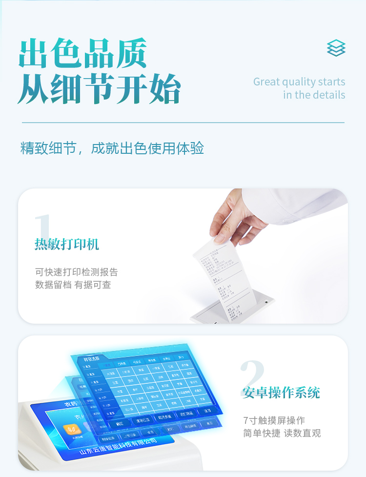 | 機器采用全新安卓智能系統(tǒng),主控芯片采用 ARM Cortex-A7,RK3288/4核處理器,主頻1.88Ghz,運轉(zhuǎn)速度更快速,穩(wěn)定性更強。 | 創(chuàng)新檢測模式: *儀器采用精密旋轉(zhuǎn)比色池設(shè)計,使用光源一致,可以解決各通道間由于光源誤差帶來的檢測結(jié)果誤差問題,檢測結(jié)果更加精準。 *儀器具有自動識別比色皿檢測功能,即:將樣品比色皿放入儀器后,點擊樣品檢測,儀器自動識別比色皿進行通道檢測。 | 供電方式:交直流兩用,直流 12V 供電,可連接車載電源,可配 6ah 大容量充電鋰電池,方便戶外流動測試。 | 顯示方式:7英寸液晶觸摸屏顯示,人性化中文操作界面,讀數(shù)直觀、簡單。 | 檢測通道:8個檢測通道,可以同時測試多個樣品,循環(huán)檢測,即放即檢,每個樣品由程序控制分別獨立工作,不會互相干擾。 | 高精光源系統(tǒng): ①①儀器光源采用進口超高亮發(fā)光二極管,光源亮度可以自動調(diào)節(jié)與校準 ②智能恒流穩(wěn)壓,光強自動校準,長時間連續(xù)工作光源無溫漂現(xiàn)象。 | 智能操作分析系統(tǒng): ①儀器具有100多種蔬菜名稱菜單庫,分類管理,并可按需添加或刪除、編輯蔬菜名稱;可在同一檢測界面自動對應(yīng)相關(guān)檢測通道一次性選擇1-24個樣品名稱,無需退出界面,節(jié)省操作時間。 ②內(nèi)置新國家限量標(biāo)準,與所測結(jié)果進行現(xiàn)場比對,并持續(xù)更新標(biāo)準。 | 完善的配套硬件: ①采用串口5v打印機,可選擇手動打印或者自動打印,三分鐘出打印結(jié)果,打印格式為檢測人姓名、吸光度差值、檢測時間、檢測機構(gòu)、樣品名稱及結(jié)果判定。 ②儀器具有無線上傳模塊,檢測結(jié)果可批量打印,批量上傳。 | 數(shù)據(jù)調(diào)用: ①儀器可存儲20萬條檢測結(jié)果, ②檢測結(jié)果為Excel表格,方便后期進行數(shù)據(jù)分析與匯總報告 ③儀器采用USB2.0接口設(shè)計,支持 U 盤存儲,方便數(shù)據(jù)的存貯和移動,并可隨時與計算機直接相連,實現(xiàn)數(shù)據(jù)查詢、瀏覽、分析、統(tǒng)計、打印等。 | 后期產(chǎn)品固件可升級。 | 安全證書,放心保障:儀器具有中國計量科學(xué)研究院校準證書,權(quán)威認證,使用放心。 |