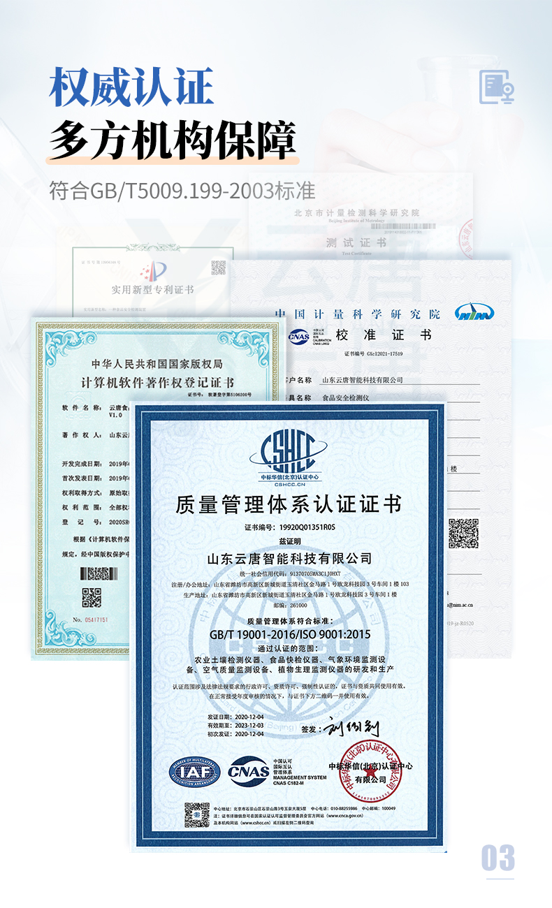 山東云唐智能科技有限公司生產(chǎn)的高智能食品安全檢測(cè)儀為集成化食品安全快速檢測(cè)分析設(shè)備,采用臺(tái)式一體化設(shè)計(jì),可快速檢測(cè)200多種食品安全項(xiàng)目,包含非食用化學(xué)物質(zhì)、濫用食品添加劑、農(nóng)藥殘留、獸藥殘留、重金屬、病害肉、營(yíng)養(yǎng)強(qiáng)化劑、抗生素類殘留、激素類殘留、真菌毒素類殘留、化學(xué)類殘留等項(xiàng)目的定性定量檢測(cè)。該高智能食品安全檢測(cè)儀為集成化食品安全快速檢測(cè)分析設(shè)備,目前已于食藥監(jiān)局、衛(wèi)生部門、高教院校、科研院所、農(nóng)業(yè)部門、養(yǎng)殖場(chǎng)、屠宰場(chǎng)、食品肉產(chǎn)品深加工企業(yè)及檢驗(yàn)檢疫部門等單位廣泛使用。