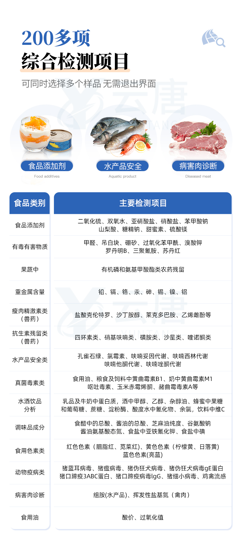 | 食品添加劑:二氧化硫、雙氧水、亞硝酸鹽、硝酸鹽、苯甲酸鈉、山梨酸鉀、糖精鈉、甜蜜素、木耳硫酸鎂等 | 有毒有害物質(zhì):甲醛、吊白塊、硼砂、過(guò)氧化苯甲酰、溴酸鉀、羅丹明B、三聚氰胺、蘇丹紅、工業(yè)堿、尿素、明礬等 | 果蔬:農(nóng)藥殘留(酶抑制率法) | 病害肉診斷:組胺、揮發(fā)性鹽基氮; | 重金屬含量:鉛、鎘、鉻、汞、砷、錫、鎳、鋁等; | 食用油脂: 過(guò)氧化值、酸價(jià)等 | 瘦肉精激素類(獸藥):鹽酸克倫特羅、沙丁胺醇、萊克多巴胺、己烯雌酚等 | 抗生素殘留類(獸藥):四環(huán)素類、硝基呋喃類、磺胺類、β-興奮劑類、沙星類、磺胺類、喹諾酮類,甲砜霉素,氟苯尼考,金剛烷胺、替米考星、慶大霉素、林可霉素、鏈霉素、恩諾沙星、環(huán)丙沙星、頭孢啦啶、青霉素、阿莫西林等 | 真菌毒素類:食用油、糧食及飼料中黃曲霉毒素B1、黃曲霉毒素總量,奶中黃曲霉毒素M1、嘔吐毒素、玉米赤霉烯酮、赭曲霉毒素A、T2毒素、伏馬毒素等; | 水酒飲品分析:酒中甲醇、乙醇、乳品及牛奶中蛋白質(zhì), | 調(diào)味品成分:食醋的總酸、醬油的總酸、芝麻油純度、谷氨酸鈉、醬油氨基酸態(tài)氮、食鹽中亞鐵氰化鉀、食鹽中碘等 | 食用色素類:紅色色素(胭脂紅、莧菜紅、赤蘚紅、誘惑紅)、黃色色素(檸檬黃、日落黃)、藍(lán)色色素(亮藍(lán))等 | 動(dòng)物疫病類:禽流感、新城疫、牛羊口蹄疫、牛羊結(jié)核病、牛羊包蟲、牛羊布病、小反芻獸、豬藍(lán)耳病毒、豬瘟病毒、豬偽狂犬病毒、豬細(xì)小、豬圓環(huán)、犬細(xì)小病毒、犬瘟熱病毒、犬狂犬病毒等; | 蜂蜜成分:果糖和葡萄糖、蔗糖、淀粉酶、酸度等 | 水產(chǎn)品安全類:孔雀石綠、氯霉素、呋喃妥因、呋喃西林、呋喃它酮、呋喃唑酮等 | 蛋類藥物殘留:氯霉素,四環(huán)素,磺胺類,喹諾酮類,呋喃西林,呋喃它酮,呋喃妥因,呋喃唑酮,氟苯尼考,阿莫西林、頭孢氨芐、紅霉素、鏈霉素等 |