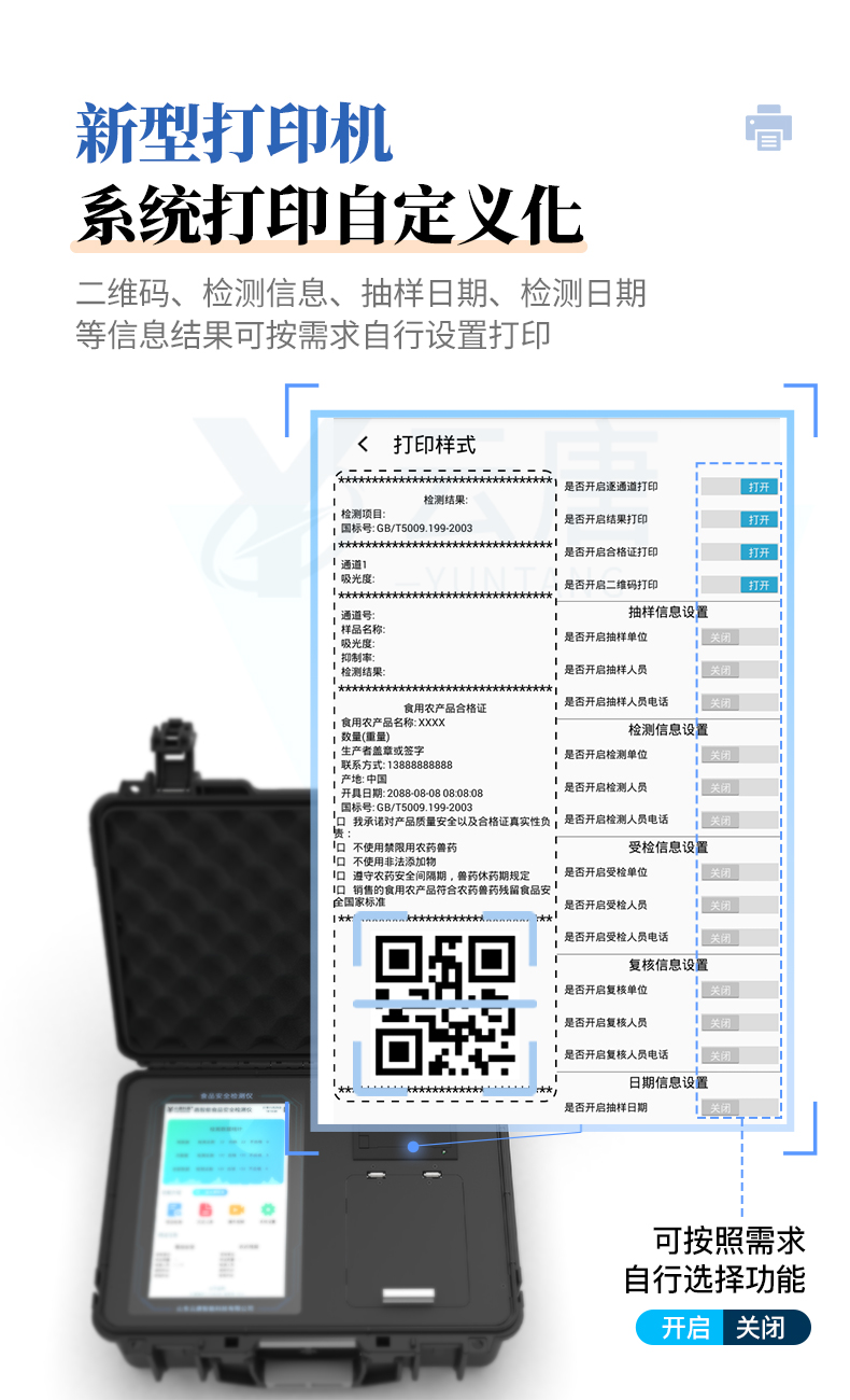 儀器采用手提式一體化系統(tǒng)檢測技術(shù),將分光光度模塊、膠體金檢測模塊、新型農(nóng)殘檢測模塊、數(shù)字化管理模塊、無線通訊模塊高度集成于一體,支持檢測200種食品安全檢測項(xiàng)目,同時(shí)預(yù)留升級(jí)檢測方法。儀器檢測模塊標(biāo)準(zhǔn)化、智能化,檢測項(xiàng)目可隨意自由組合。檢測箱體內(nèi)置多個(gè)標(biāo)準(zhǔn)檢測單元,檢測模塊可以調(diào)整配置。顯示屏幕:儀器采用10.1英寸豎向液晶觸摸屏顯,搭配運(yùn)行安卓智能操作系統(tǒng),主控芯片采用ARM Cortex-A7,RK3288/4核處理器,主頻1.88Ghz,操作方便,性能更強(qiáng)。檢測通道:≥12通道;采用精密旋轉(zhuǎn)比色池設(shè)計(jì),使用同芯片同光源校準(zhǔn)精度,解決不同光源之間的誤差值,更加準(zhǔn)確**。(1-12通道間誤差0.1%,***:**202022821055.2)儀器光源:高精度進(jìn)口四波長冷光源,每個(gè)通道均配置 410、520、590、630nm 波長光源,標(biāo)配**的光路切換裝置,專利光路切換功能可實(shí)現(xiàn)64波長,并且所有檢測項(xiàng)目可實(shí)現(xiàn)所有通道同時(shí)檢測。設(shè)備可一鍵校準(zhǔn),自動(dòng)保存校準(zhǔn)數(shù)據(jù),自動(dòng)對(duì)比校驗(yàn),得到精準(zhǔn)光源,采用Android SP存儲(chǔ)數(shù)據(jù),光源數(shù)據(jù)永不丟失,方便每一次使用。通訊接口:配備無線通信模塊、4G(APN)通訊模塊、藍(lán)牙傳輸,同時(shí)具有雙USB接口以及RJ45網(wǎng)線接口,可以多方式實(shí)現(xiàn)數(shù)據(jù)保存及數(shù)據(jù)傳輸。存儲(chǔ)方式:支持U盤存儲(chǔ),標(biāo)準(zhǔn)USB接口,免驅(qū)動(dòng)安裝。檢測結(jié)果存儲(chǔ)容量20萬條以上,可生成Excel表格進(jìn)行拷貝,并具有登錄保護(hù)功能。智能化操作系統(tǒng):: ★操作系統(tǒng):儀器可在同一檢測界面自動(dòng)對(duì)應(yīng)相關(guān)檢測通道,一次性選擇1-12個(gè)樣品名稱,無需退出界面,節(jié)省操作時(shí)間。并可以對(duì)每個(gè)通道屬性和樣品信息單獨(dú)進(jìn)行編輯,例如送檢單位、人員,檢測人員等,打印時(shí)勾選打印顯示。★數(shù)據(jù)集成系統(tǒng):設(shè)備首頁自動(dòng)匯總分析檢測數(shù)據(jù),包含:周檢測數(shù)據(jù)、月檢測數(shù)據(jù),全部檢測總數(shù)量,均包含檢測總數(shù),合格數(shù),不合格數(shù),以及相關(guān)柱形分析圖,各項(xiàng)檢測數(shù)據(jù)一目了然,無需電腦查詢,更加快捷直觀。★數(shù)據(jù)庫系統(tǒng):十幾項(xiàng)數(shù)據(jù)庫分類管理儀器:包含項(xiàng)目類型、項(xiàng)目數(shù)據(jù)、檢測數(shù)據(jù)、歷史記錄、國標(biāo)信息、曲線信息、采樣信息、檢測信息、受檢信息、復(fù)核信息、圖表信息、光源校準(zhǔn)信息、打印樣式信息、樣品庫信息等等,數(shù)據(jù)庫之間互相協(xié)調(diào)聯(lián)動(dòng)保證數(shù)據(jù)的真實(shí)完整性。同時(shí)產(chǎn)品數(shù)據(jù)庫以及歷史檢測記錄支持一鍵檢索功能。★限量規(guī)判系統(tǒng):具有限量查詢、添加物質(zhì)合規(guī)判定系統(tǒng)。檢測出結(jié)果后,系統(tǒng)自動(dòng)調(diào)用系統(tǒng)數(shù)據(jù)庫中相關(guān)國標(biāo)進(jìn)行比對(duì)判定,客觀顯示判定結(jié)果是否合格★項(xiàng)目預(yù)設(shè)系統(tǒng):儀器具有任務(wù)預(yù)設(shè)模塊,一鍵提前預(yù)設(shè),給出方便快捷的新檢測方案,每一個(gè)任務(wù)分別可以設(shè)置不同的樣品、批次、編號(hào)、來源、備注、抽樣信息、檢測信息、受檢信息、復(fù)核信息等更多信息。樣品送檢時(shí)一鍵調(diào)取保存信息,并可多次調(diào)取,大大提高檢測效率。★數(shù)據(jù)監(jiān)管系統(tǒng):同步對(duì)接監(jiān)管平臺(tái),數(shù)據(jù)可局域網(wǎng)和互聯(lián)網(wǎng)數(shù)據(jù)上傳,檢測結(jié)果可選擇直接傳至食品安全監(jiān)管平臺(tái)。進(jìn)行區(qū)域食品安全監(jiān)管及大數(shù)據(jù)分析處理與數(shù)據(jù)統(tǒng)計(jì),檢測區(qū)域食品安全長短期動(dòng)態(tài),達(dá)到食品安全問題預(yù)估、預(yù)警。★打印系統(tǒng):內(nèi)置全新打印機(jī),新創(chuàng)自定義打印方式,可按需靈活勾選控制:產(chǎn)品合格證(國家農(nóng)業(yè)部標(biāo)準(zhǔn)要求),二維碼,抽樣信息、檢測信息,受檢信息、復(fù)核信息、抽樣日期、檢測日期等信息的打印。供電模式:儀器交直流兩用,直流12V供電,可連接車載電源,可配6ah大容量充電鋰電池,電量可實(shí)時(shí)顯示,方便戶外流動(dòng)測試。膠體金檢測模塊:采用雙通道CMOS成像處理技術(shù)及膠體金免疫層析技術(shù),可同時(shí)讀取雙膠體金卡數(shù)據(jù),自動(dòng)采集、處理分析,將檢測結(jié)果顯示,并可根據(jù)參考限值自動(dòng)判斷檢測結(jié)果,可檢測常見的獸藥殘留、生物毒素、抗生素、違禁添加物等。★探測技術(shù):CMOS成像探測;★檢測通道:1個(gè)通道;★檢測方式:消線法和比色法;★顯示模式:陰性或陽性;★曲線形式:軌道式掃描方式,顯示金標(biāo)卡圖像,實(shí)時(shí)生成、識(shí)別CT曲線圖,無需手動(dòng)調(diào)整,完成檢測后自動(dòng)退出檢測卡。兼容市場上其他金標(biāo)卡,使用耗材不受限制。儀器加入遠(yuǎn)程升級(jí)功能,可定向分客戶分儀器更新,開機(jī)后自動(dòng)更新,客戶無需