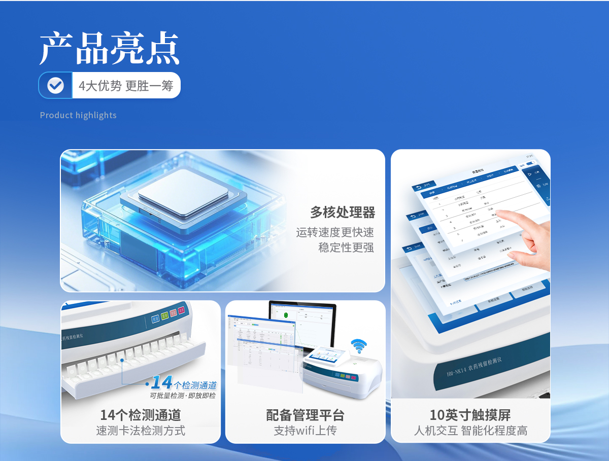 1、★采用速測卡法,省卻冗雜的步驟,提高檢測體驗和效率    2、安卓智能系統(tǒng)7.1版本,操作更加流暢,使用更方便。    3、★10英寸高靈敏真彩觸摸屏顯示,交互性用戶體驗更好。    4、★具有14個檢測卡通道,可更多的批量測試樣品,即放即檢,檢測效率更高。    5、支持wifi、藍牙傳輸,數(shù)據(jù)可無線上傳;支持U盤拷貝數(shù)據(jù),免驅(qū)動插拔。    6、配置食品安全管理平臺,檢測結(jié)果可長期存儲,進行長短期查看分析,輔助管理。    7、儀器具有分類管理蔬菜名稱菜單庫,并可按需編輯蔬菜名稱、檢測單位等信息。    8、內(nèi)置熱敏打印機,可選擇性打印詳細的檢測信息。    9、★檢測過程中檢測倉自動彈出,自動關(guān)閉。    10、主控采用多核處理器,主頻1.88Ghz,運轉(zhuǎn)速度更快速,穩(wěn)定性更強。