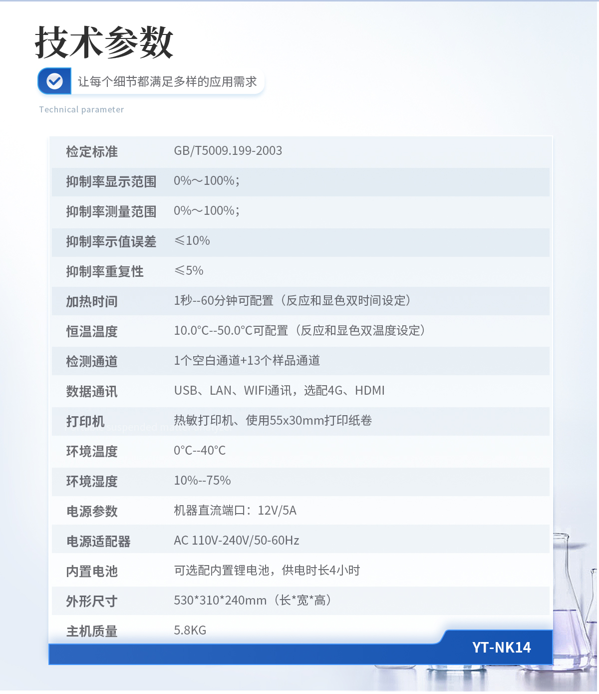 檢定標準:GB/T5009.199-2003    抑制率顯示范圍:0%~100%;    抑制率測量范圍:0%~100%;    抑制率示值誤差:≤10%    抑制率重復(fù)性:≤5%    加熱時間:1秒--60分鐘可配置(反應(yīng)和顯色雙時間設(shè)定)    恒溫溫度:10.0℃--50.0℃可配置(反應(yīng)和顯色雙溫度設(shè)定)    檢測通道:1個空白通道+13個樣品通道    數(shù)據(jù)通訊:USB、LAN、WIFI通訊,選配4G、HDMI    打印機:熱敏打印機、使用55x30mm打印紙卷    環(huán)境溫度:0℃--40℃    環(huán)境濕度:10%--75%    電源參數(shù):機器直流端口:12V/5A    電源適配器:AC 110V-240V/50-60Hz    內(nèi)置電池:可選配內(nèi)置鋰電池,供電時長4小時    外形尺寸:530*310*240mm(長*寬*高)    主機質(zhì)量:5.8KG